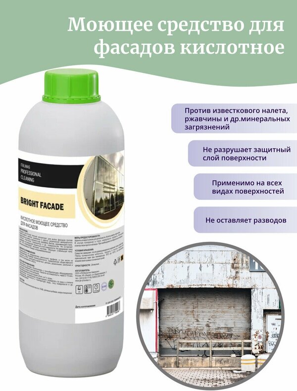 Жидкий кислотный пенный концентрат для мойки фасадов против известкового налета, ржавчины и других загрязнений минерального характера на камне, кирпиче и др. керамике, бетоне, нержавеющей стали, стёклах, пластиках, окрашенных и др. поверхностях.