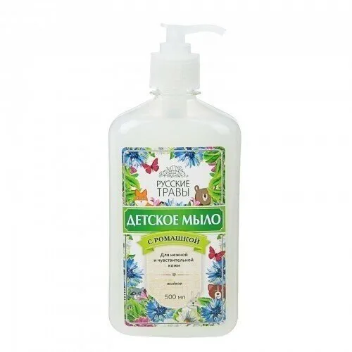 Крем-мыло жидкое Русские Травы «Детское» с дозатором и объемом 500 мл представляет собой высококачественное средство для ежедневного ухода за кожей. Продукт производится в России и предназначен для всех типов кожи, включая детскую.