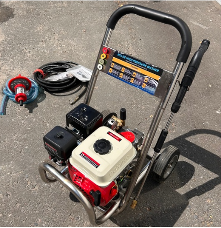 Давление 180 бар, ресурсный бензиновый двигатель 7,5 л/с, шланг 10 метров, удобный крепкий пистолет, 4 насадки разного угла распыления, водонасос с отдельной выносной насадкой двойного фильтрования, мобильная тележка на колесах 35 кг.