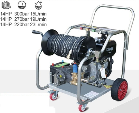Давление 300 бар, ресурсный дизельный двигатель 14 л/с, стартер запуска, топливный бак 5 л, шланг 30 метров, удобный крепкий пистолет, 4 насадки разного угла распыления, водонасос с отдельной выносной насадкой двойного фильтрования, мобильная тележка на колесах, вес 140 кг.