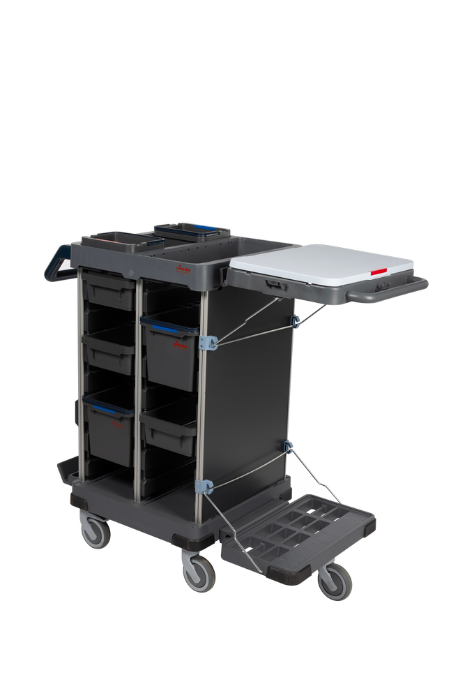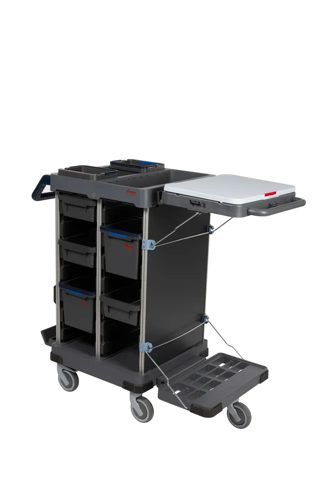 - Комплектация Платформа cо встроенными мягкими бамперами, верхние секции, опоры 6 шт., колеса 4 шт. (1 шт. со стопором), подставка для держателей для мопов 1 шт., верхняя транспорт. ручка с 5 фиксаторами 1 шт., откидная подставка 1 шт. и верхняя секция для чехла 1 шт.