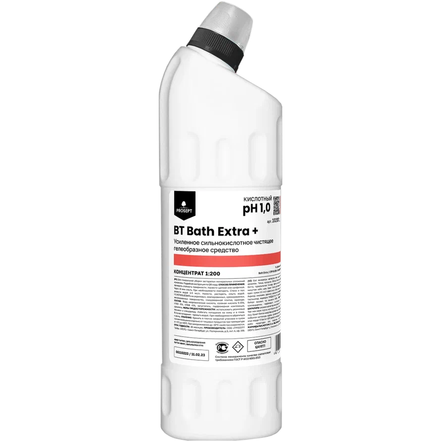 BT Bath Extra + Сильнокислотный гель-концентрат, предназначенный для генеральной уборки больших массивов застарелых минеральных отложений и глубоко въевшейся ржавчины. Он эффективно удаляет водный и мочевой камень, ржавчину, известковые налеты, грязе-солевые и жировые отложения.