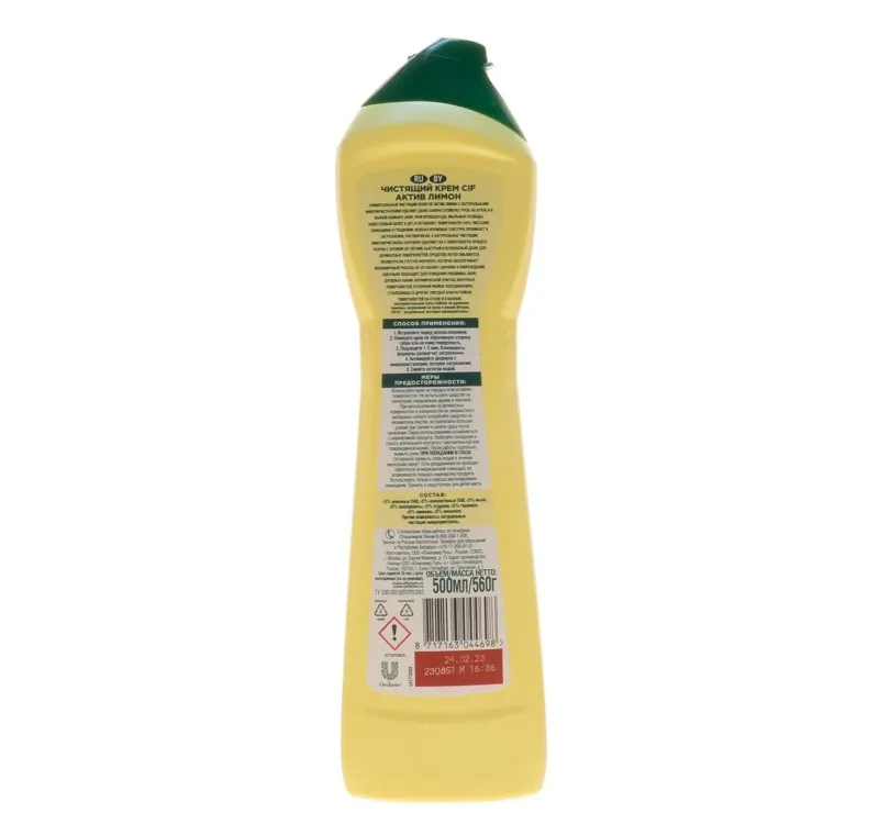 Чистящий крем Cif Актив Лимон с микрокристаллами удаляет 100% грязи на кухне и в ванной, оставляя поверхности 100% сияющими и гладкими. Легко смывается. Крем проникает и полностью удаляет такие въевшиеся и застарелые загрязнения, как засохший жир, пригоревшая еда, мыльные разводы и известковый налёт. Улучшенная текстура позволяет легко смывать средство, чтобы сразу наслаждаться сияющим результатом. Чистящий крем подходит для использования на кухне на таких поверхностях, как плита, варочная поверхность, в том числе стеклокерамическая, мойка, духовой шкаф, столешница и т.д., и в ванной, в таких местах, как раковина, ванна, в том числе акриловая, керамическая плитка, хромированные поверхности, краны и т.д.Премущества данного средства:- Большой формат;- Не царапает поверхность;- Удаляет грязь благодаря силе микрокристаллов;- Легко смывается.Состав: <5% анионные ПАВ, <5% неионогенные ПАВ, <5% мыло, <5% отдушка, <5% линалоол, <5% бензизотиазолинон, <5% лимонен.Способ применения: нанести крем на влажную тряпочку или на саму поверхность. Для достижения наилучшего результата оставить на несколько минут. Протереть и смыть водой.Объём: 500 мл