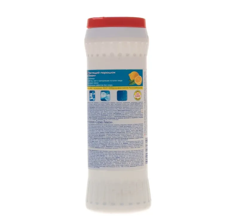 Чистящий порошок Sarma Лимон 400 г прекрасно очищает посуду от налётов, жира и пригоревших остатков пищи. Также подходит для чистки, отбеливания и антибактериальной обработки фаянсовых, керамических и эмалированных поверхностей, поддающихся абразивному воздействию, по всему дому. Обладает доказанным антибактериальным эффектом без хлора. Средство может быть рекомендовано к использованию в детских, школьных учреждениях, санаторно-курортных учреждениях, предприятиях гостиничного хозяйства, общественного питания и иных предприятиях и организациях, где требуется очистка и антибактериальная обработка поверхностей.