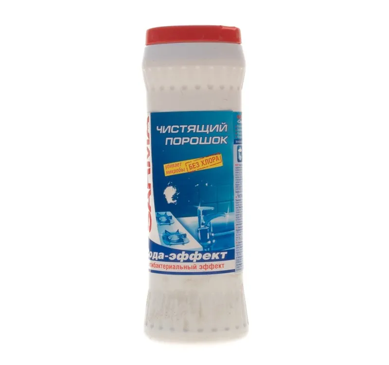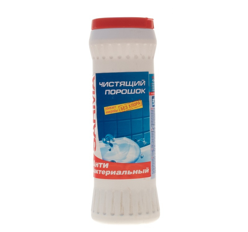 Чистящий порошок предназначен для очищения поверхностей ванной и кухни (для кафеля, сантехники, керамических и фаянсовых поверхностей в ванной комнате). Обладает высокой чистящей способностью, отбеливает и уничтожает бактерии без хлора. Обладает антибактериальным эффектом. Удаляет застарелые и пригоревшие загрязнения. Прекрасно очищает посуду от налётов, жира и пригоревших остатков пищи. Обладает доказанным антибактериальным эффектом без хлора. Средство может быть рекомендовано к использованию в детских, школьных учреждениях, санаторно-курортных учреждениях, предприятиях гостиничного хозяйства, общественного питания и иных предприятиях и организациях, где требуется очистка и антибактериальная обработка поверхностей.Способ применения: нанести на увлажнённую поверхность, почистить, смыть водой. Для отбеливания и антибактериальной обработки равномерно распределить по влажной поверхности, оставить на 3-5 минут, смыть водойСостав: абразив, сода, кислородосодержащий отбеливатель 5%, АПАВ 5%, антибактериальный компонент, краситель, отдушка.