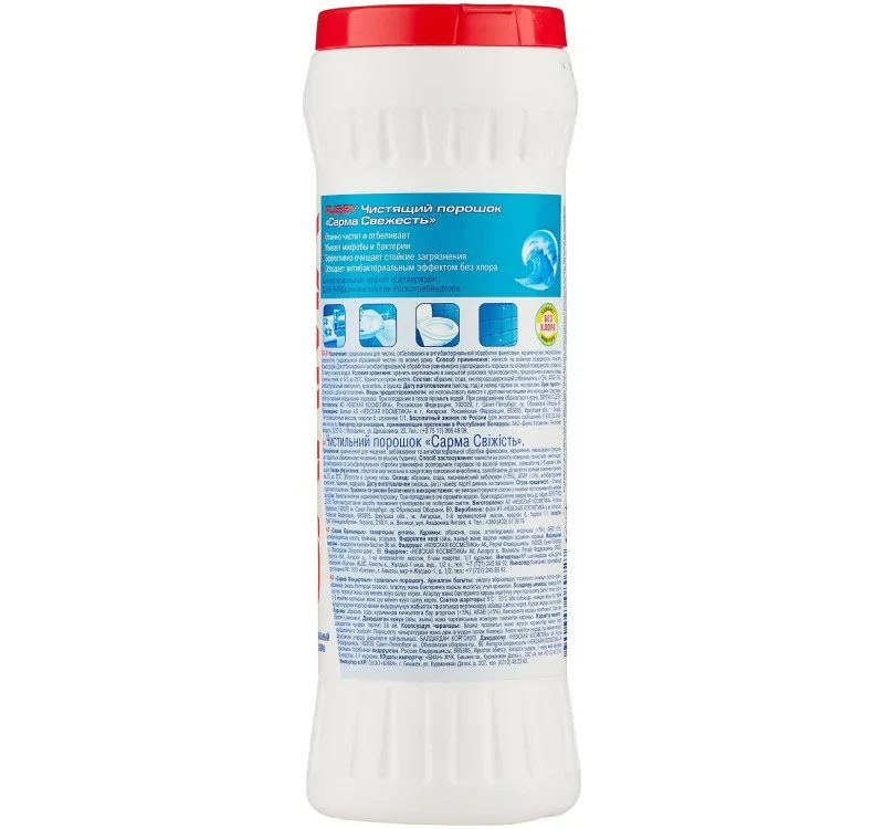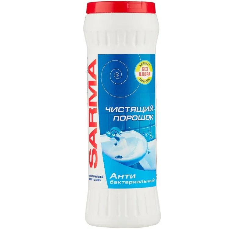 Чистящий порошок Sarma Свежесть 400 г прекрасно очищает посуду от налётов, жира и пригоревших остатков пищи. Обладает доказанным антибактериальным эффектом без хлора. Средство может быть рекомендовано к использованию в детских, школьных учреждениях, санаторно-курортных учреждениях, предприятиях гостиничного хозяйства, общественного питания и иных предприятиях и организациях, где требуется очистка и антибактериальная обработка поверхностей.