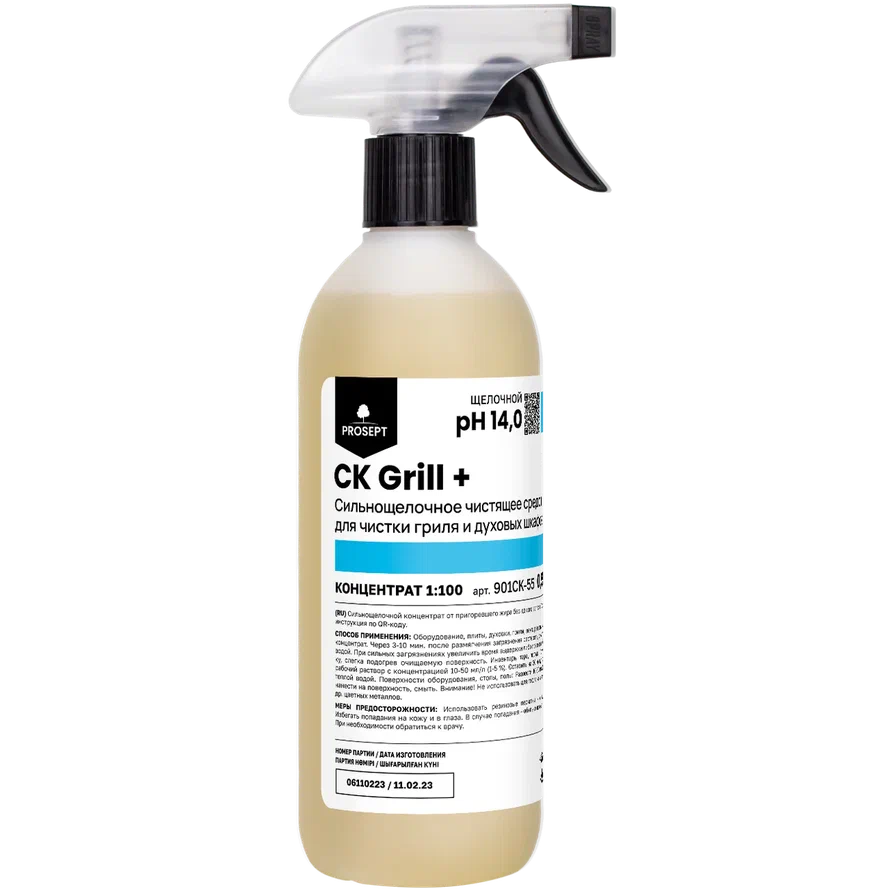 CK Grill+ сильнощелочное низкопенное средство, которое используется для удаления пригаров и засохших загрязнений, таких как растительные и животные жиры, масло, сахар и другие. Этот продукт также способен справиться с застарелыми и плотными пригарами. Кроме того, он нейтрализует неприятные запахи.