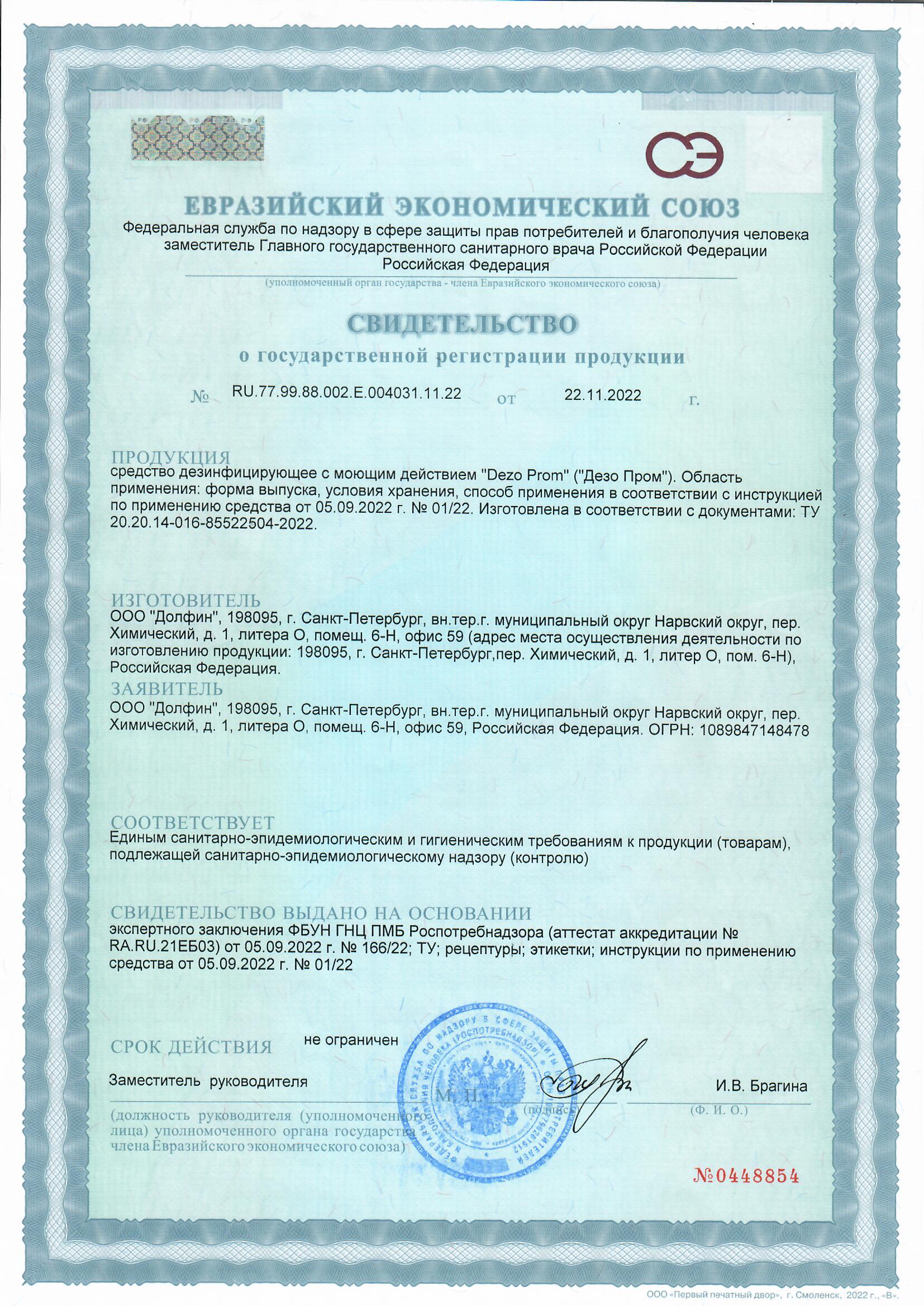 - Генеральная уборка Средство используется в соответствии с инструкцией №01/22 по применению средства дезинфицирующего с моющим действием DEZO PROM.