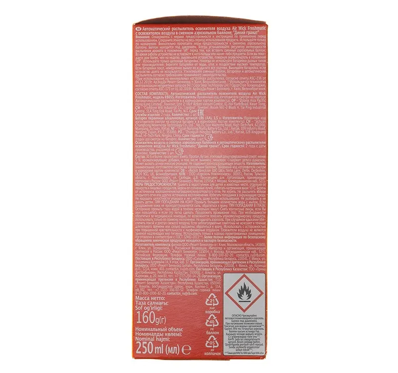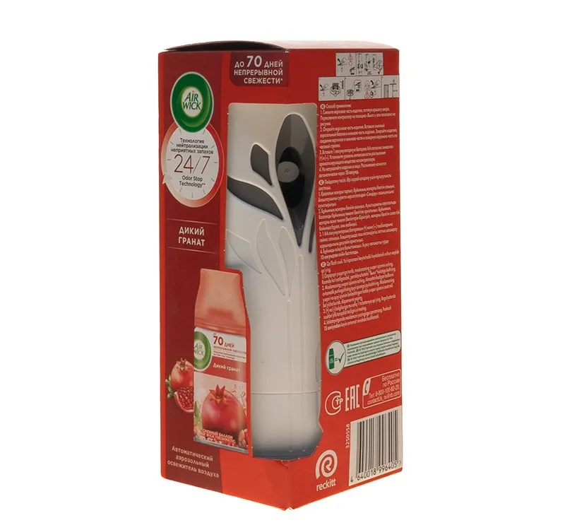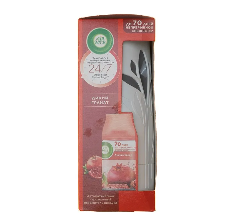 Диспенсер автоматический для аэрозольного освежителя Airwick предназначен для автоматической ароматизации воздуха и удаления неприятных запахов в помещениях (офисе, ресторане, туалете, помещении для курения и т. д.) путём распыления из аэрозольного баллона. Аэрозольный баллон входит в комплект. Работает от батареек АА/LR6. Крепление к стене осуществляется путём навешивания диспенсера на винт или крючок в стене (на диспенсере присутствует грушевидное отверстие). К диспенсеру можно приобретать сменные баллоны.