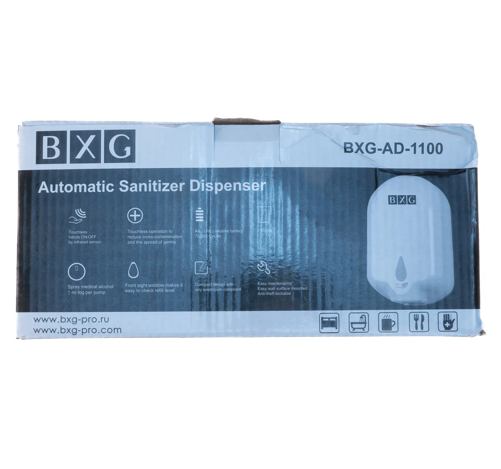 BXG-AD-1100 -автоматический дозатор жидких дезинфицирующих средств, антисептиков. Подача средства осуществляется автоматически, при помощи сенсорного инфракрасного датчика, что обеспечивает бесконтактное, безопасное, использование дозатора. Дозатор выполнен из ударопрочного пластика ABS белого цвета и оснащён смотровым окном, для контроля уровня дезинфицирующего средства. Используются жидкие дезинфицирующие средства, антисептики. Устроен по принципу распыления (спрей). Надёжная система подачи исключает протекание, а наличие запорного механизма предотвращает попадание посторонних предметов в бак, кражу дезинфицирующего средства. Дозатор работает от батареек тип АА (4 шт ), не входят в комплект. Исполнение дозатора в классическом белом цвете позволяет удачно сочетать его с другим оборудованием в туалетной комнате. BXG-AD-110 отлично впишется как в современный, так и в классический интерьер. Особенности: Бесконтактное использование. Распыление жидкости /средства (спрей). Объём резервуара - 1100 мл Зона срабатывания сенсорного датчика 3-10 см Настройка диапазона срабатывания сенсорного датчика. Звуковая индикация выдачи средства. Экономичное расходование средства: 1 мл - дозировка одной выдачи. Работает от батареек (4х1,5в тип АА). Смотровое окно. Закрывается на ключ.