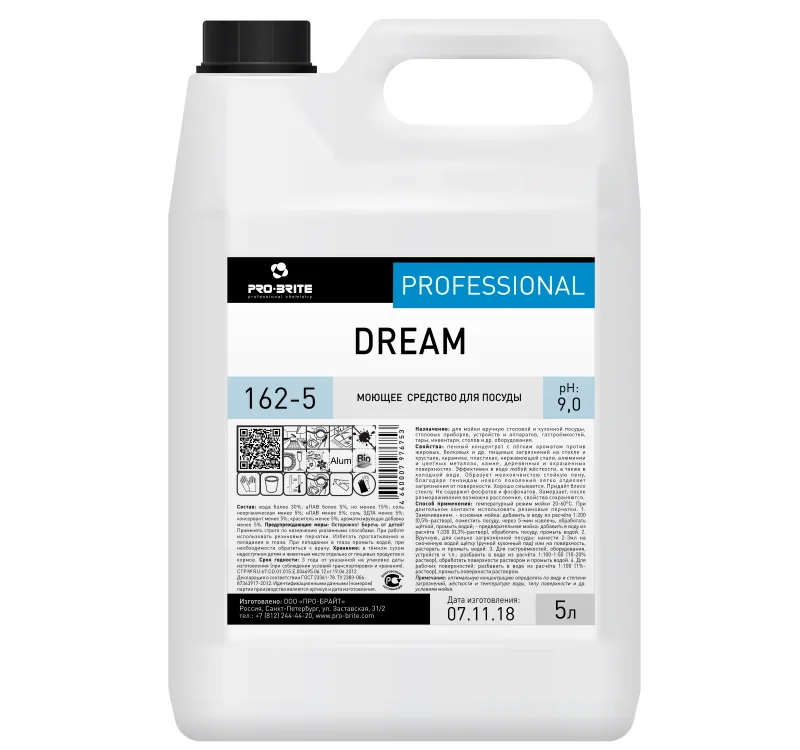 Средство для мытья посуды 5л Pro-Brite DREAM гель (162-5)