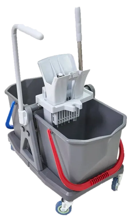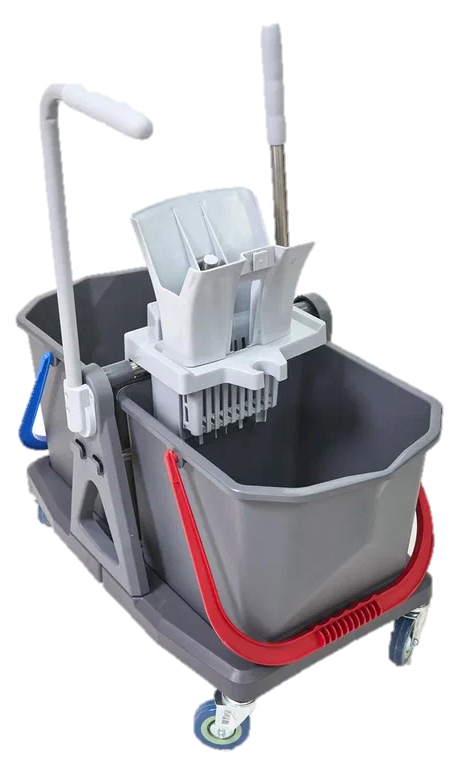 Лёгкая пластиковая тележка комплектуется двумя ведрами емкостью 25 литров (имеют цветовую кодировку) и туннельным отжимом Росмоп Кваттро.