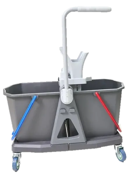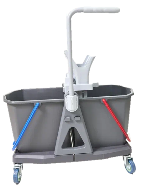 Лёгкая пластиковая тележка комплектуется двумя ведрами емкостью 25 литров (имеют цветовую кодировку) и туннельным отжимом Росмоп Кваттро Лайт.