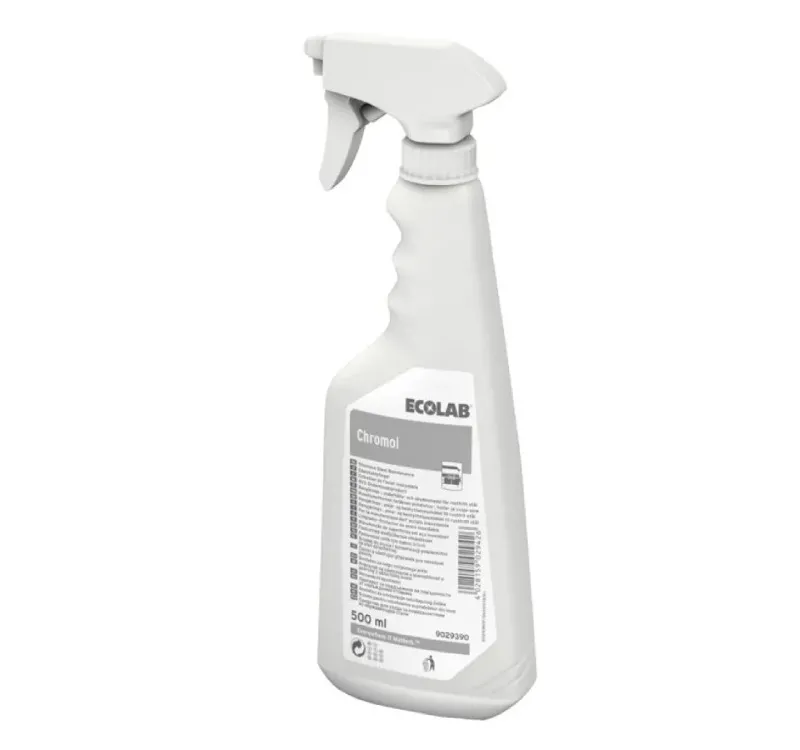 Моющее средство Ecolab Chromol отмывает поверхности из нержавеющей стали, оставляя на них сверкающую защитную пленку, которая предотвращает загрязнения. Средство бережно удаляет отпечатки пальцев с поверхности. После нанесения средства, капли воды скатываются с поверхности, не оставляя следов. Chromol прост в использовании, экономичен и обладает приятным запахом. Защита нержавеющей стали Защищает поверхности из нержавеющей стали от отпечатков пальцев следов воды Специальная комбинация масел и защитная пленка, образующаяся на поверхности после нанесения, защищает от загрязнений. После нанесения средства поверхность можно бережно протереть. Области применения: Эффективно и бережно удаляет отпечатки пальцев. Оставляет на поверхности сверкающую защитную пленку, которая предотвращает последующие загрязнения. Используется вофисах, бизнес-центрах, на торговых предприятиях, в быту.Метод применения: Перед применением очистить поверхность моющим средством. Распылить небольшое количество средства на мягкую салфетку или непосредственно на сухую поверхность, бережно растереть. Не требует смывания.Безопасность: Беречь от детей. При попадании в глаза – промыть их большим количеством воды.Объём: 500 мл