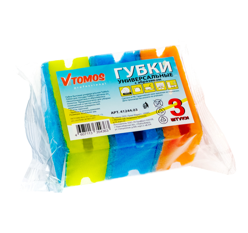 Губка бытовая универсальная ToMoS (Томос), используется для мытья посуды, очистки различных поверхностей. Абразивный слой подходит для очистки от сильных загрязнений.