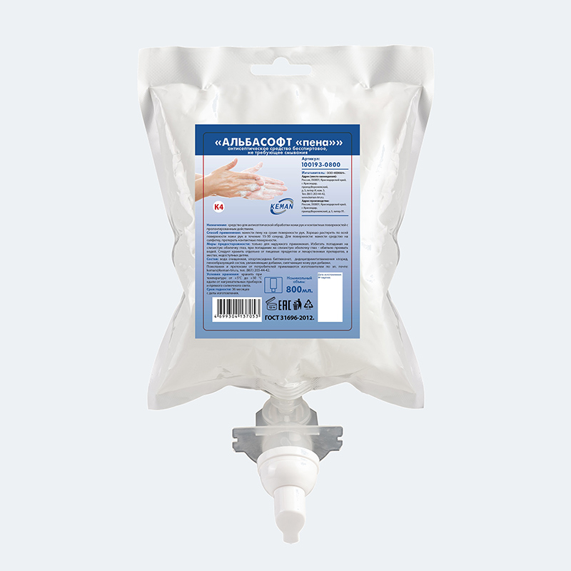 «АЛЬБАСОФТ «ПЕНА» антисептическое средство бесспиртовое, не требующее смывания ТМ КЕМАN, картридж объем 800 мл для диспенсера К4 TM KEMAN.