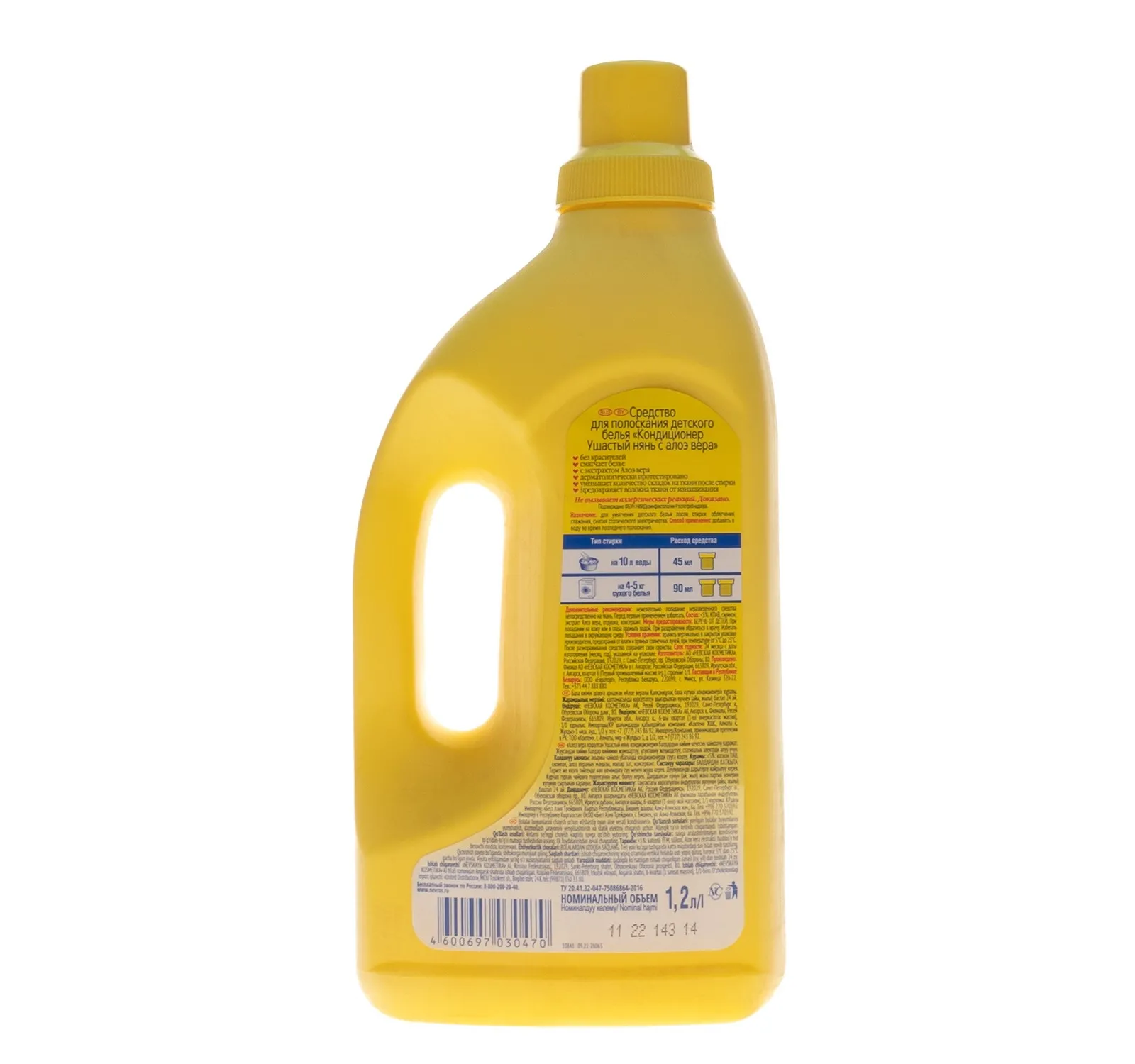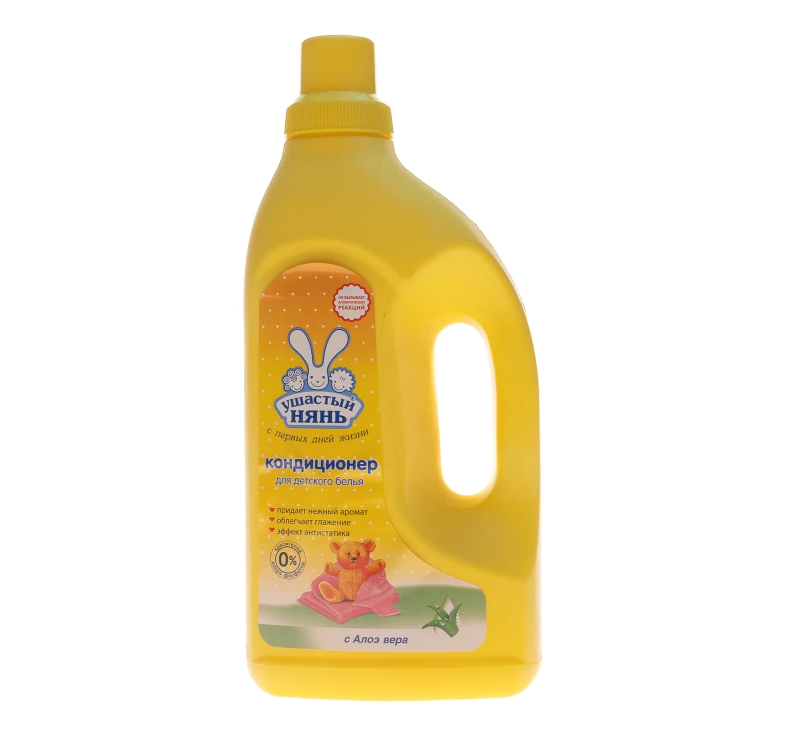 Кондиционер для белья Ушастый нянь предназначен для умягчения детского белья после стирки, облегчения глажения, снятия статического электричества. Подходит для обработки белья детей любого возраста, в том числе новорождённых, и людей, склонных к аллергическим реакциям. Преимущества данного кондиционера: смягчает бельё; облегчает глажение; снимает статическое электричество; уменьшает количество складок после стирки; предохраняет волокна ткани от изнашивания; улучшает гигроскопичность ткани (впитываемость влаги); содержит экстракт Алоэ вера, который известен своими смягчающими, увлажняющими и успокаивающими кожу свойствами; подходит для всей семьи, включая новорождённых; точно дозируется с помощью колпачка-мерника; благодаря двойным стенкам колпачка после дозировки кондиционер стекает внутрь флакона, оставляя флакон чистым и сухим; дерматологически протестирован. Не содержит красителей. Гипоаллергенно.Объём: 1,2 л