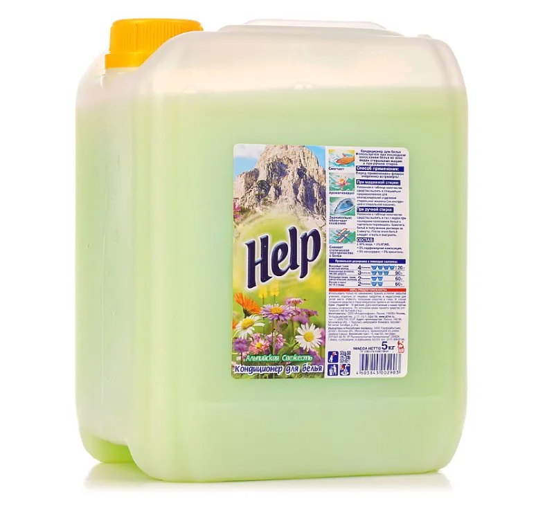 Кондиционер для белья HELP Альпийская свежесть, 5л. Средство для обработки ткани после стирки, отвечает всем современным требованиям. Придает белью мягкость, тонкий, естественный аромат. Полиэтиленовая канистра 5л. Отдушка - Альпийская свежесть. Состав: вода, менее 5% катионного ПАВ, парфюмерная композиция, консервант, краситель.