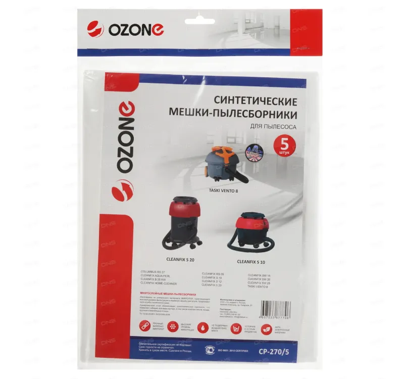 Одноразовый синтетический пылесборник OZONE CP-270 предназначен для клининговых пылесосов. Пылесборник OZONE CP-270 изготовлен из уникального синтетического материала, объединяющего в себе механическую прочность и высокие фильтрационные характеристики, а так же состоит из двухслойного фильтрующего материала. Уникальность нетканого материала заключается в наличии специальных слоев с более тонкими волокнами, способными задерживать частицы пыли до 0,5 микрон и больше. Большинство аллергенов: пыльца, споры грибов, шерсть и перхоть животных имеют размеры более 1 мкм. Поэтому фильтры OZONE обладают характеристиками HEPA-фильтров. Сама же технология производства материала подразумевает термоскрепление трёх слоёв в одно фильтрующее полотно. А в результате уже производства мешков-пылесборников OZONE применяется два слоя полотна, что в свою очередь дает 6 ступеней фильтрации.Благодаря новейшим технологиям и оборудованию, пылесборник OZONE CP-270 выдерживает высокую нагрузку до 30 кг, а также имеет 100% заполняемость мешка.Преимущества: нетканый материал. сверхтонкая фильтрация, сверхпрочные швы. высокая механическая прочность на разрыв. Предназначен для пылесосов Taski Vento 8, Cleanfix Home-Cleaner, Cleanfix Aqua Perl, Cleanfix S 10, Cleanfix S10 Plus, Cleanfix S 10 Plus Hepa, Cleanfix S, Cleanfix Sw 20