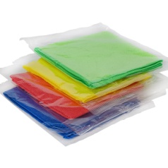 Салфетка, упакованная в индивидуальную упаковку по 250 упаковок в гофрокоробе, плотность 220 г/м², размер салфетки 35×40 см, состав: полиэстер 80%, полиамид 20%, цвета: желтый, красный, синий, зеленый.