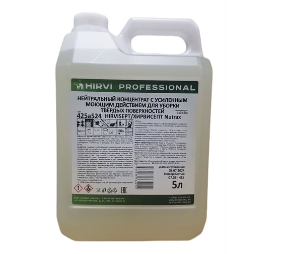 HIRVISEPT/ХИРВИСЕПТ Nutrax — жидкий нейтральный низкопенный концентрат, прозрачный светло-жёлтого цвета со специфическим запахом, против улично-бытовых и лёгких жировых загрязнений на полимерных покрытиях, кафеле и др. керамике, стёклах, ПВХ-линолеуме и др. пластиках, тераццо, камне, бетоне, нержавеющей стали, алюминии и др. металлах, текстиле, деревянных, кожаных, окрашенных и др. поверхностях.