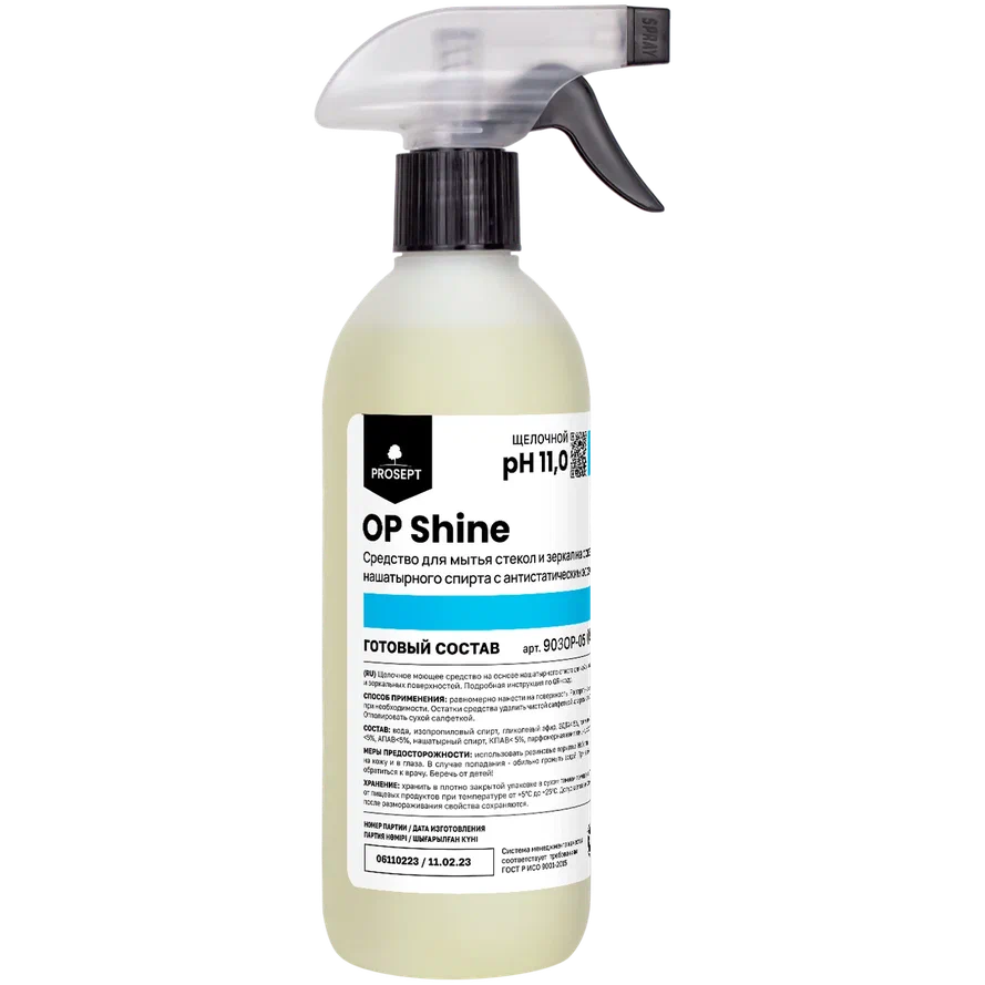 OP Shine — средство для мытья стекол и зеркал на основе нашатырного спирта с антистатическим эффектом. Оно предназначено для профессионального использования методом распыления на тряпку, что увеличивает его эффективность и снижает расход. Подходит для удаления различных типов загрязнений с любых видов стеклянных и зеркальных поверхностей.