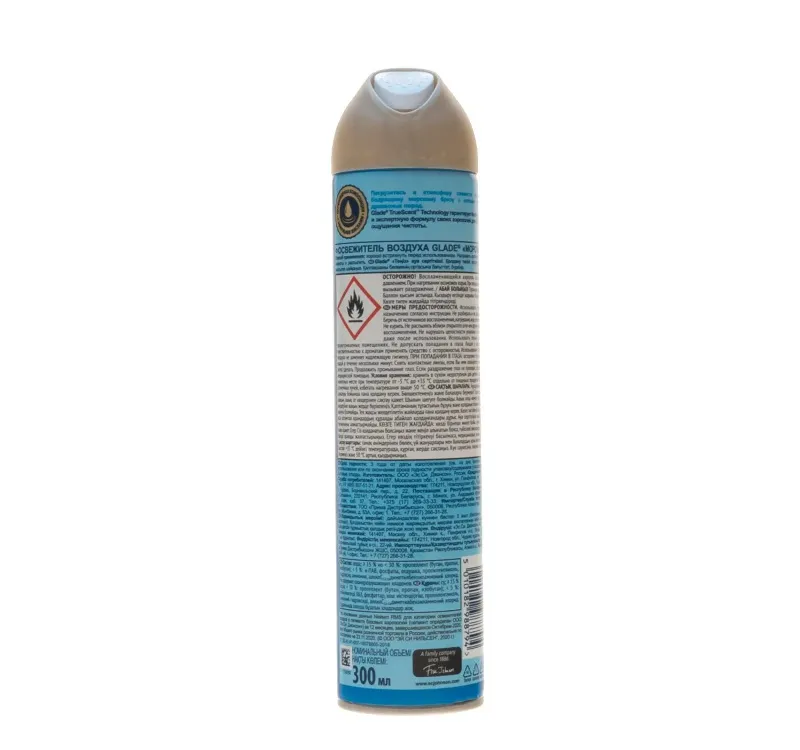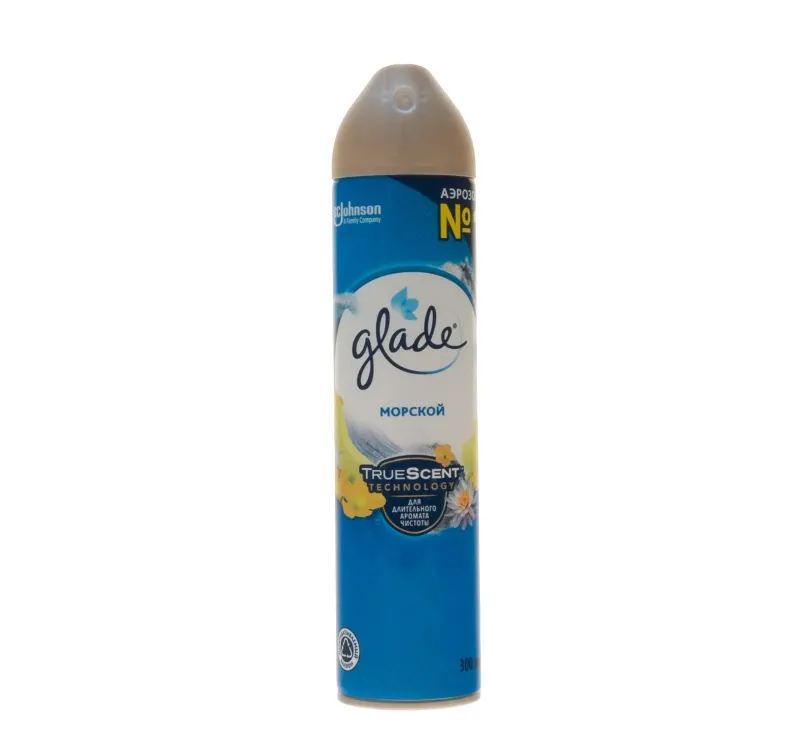 Освежитель воздуха Glade Морской 300 мл погружает в атмосферу свежести благодаря бодрящему морскому бризу с нотками светлых древесных пород. True Scent (ТМ) Technology гарантирует безопасность и экспертную формулу своих аэрозолей для создания ощущения чистоты.Преимущества освежителя воздуха Glade Морской:—Парфюмерные композиции с эфирными маслами;— Борется с неприятными запахами;— Действует мгновенно;— Ароматы высокого качества, разработанные лучшими парфюмерными домами мира;— Перерабатываемая упаковка.Способ применения: Хорошо встряхнуть перед использованием. Направить колпачок к центру комнаты и распылить. Осторожно! Воспламеняющийся аэрозоль. Баллон под давлением. При нагревании возможен взрыв.Меры предосторожности: Использовать только по назначению согласно инструкции. Не разбирать и не давать детям! Беречь от источников воспламенения, нагревания, источника искр, открытого огня. Не курить. Не распылять вблизи открытого огня или других источников воспламенения. Не нарушать целостности упаковки и не сжигать, даже после использования. Использовать только в хорошо проветриваемых помещениях. Не допускать попадания в глаза. Лицам с повышенной чувствительностью к ароматам применять средство с осторожностью. Использование освежителя воздуха не заменяет надлежащую гигиену. При попадании в глаза: осторожно промыть под водой в течение нескольких минут. Снять контактные линзы, если вы ими пользуетесь и, если это легко сделать. Продолжить промывание глаз. Если раздражение глаз не проходит, обратиться за медицинской помощью.Состав: Вода; больше или равно 15% но не менее 30%: пропеллент (бутан, пропан, изобутан); менее 5%: н-ПАВ, фосфаты, отдушка (гексилциннамаль), пропиленгликоль, гидроксид аммония, алкил (С12-16) диметилбензиламмоний хлорид. Потенциальные аллергены. Не содержит озоноразрушающих хладонов.Условия хранения: Хранить в сухом, недоступном для детей и домашних животных месте при температуре от ?5°C до +35 °C, отдельно от пищевых продуктов. Беречь от солнечных лучей, избегать нагревания выше 50°C.Срок годности: 36 месяцев. После использования или по окончании срока годности упаковку/содержимое утилизировать как бытовые отходы.Объём: 300 мл