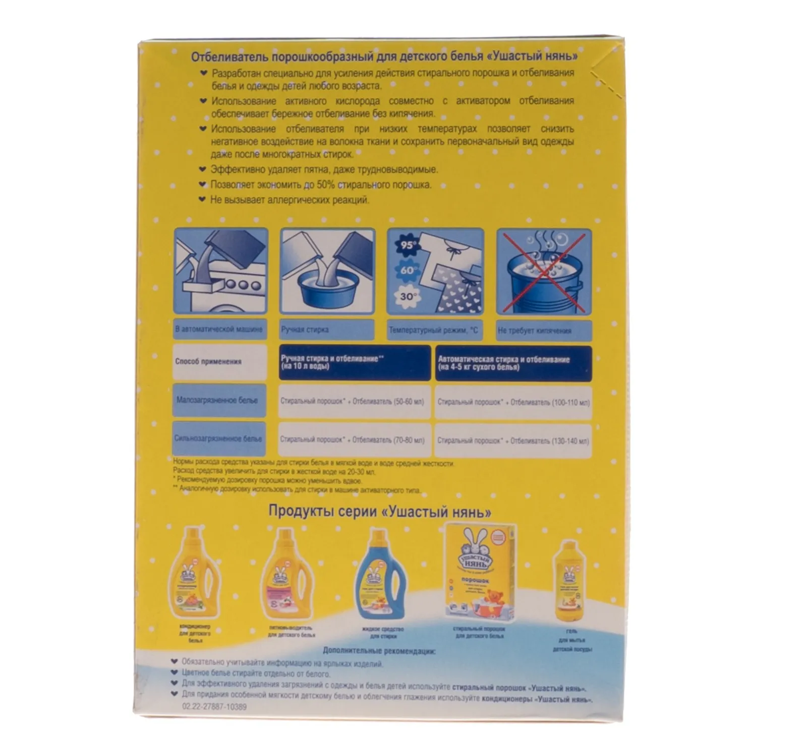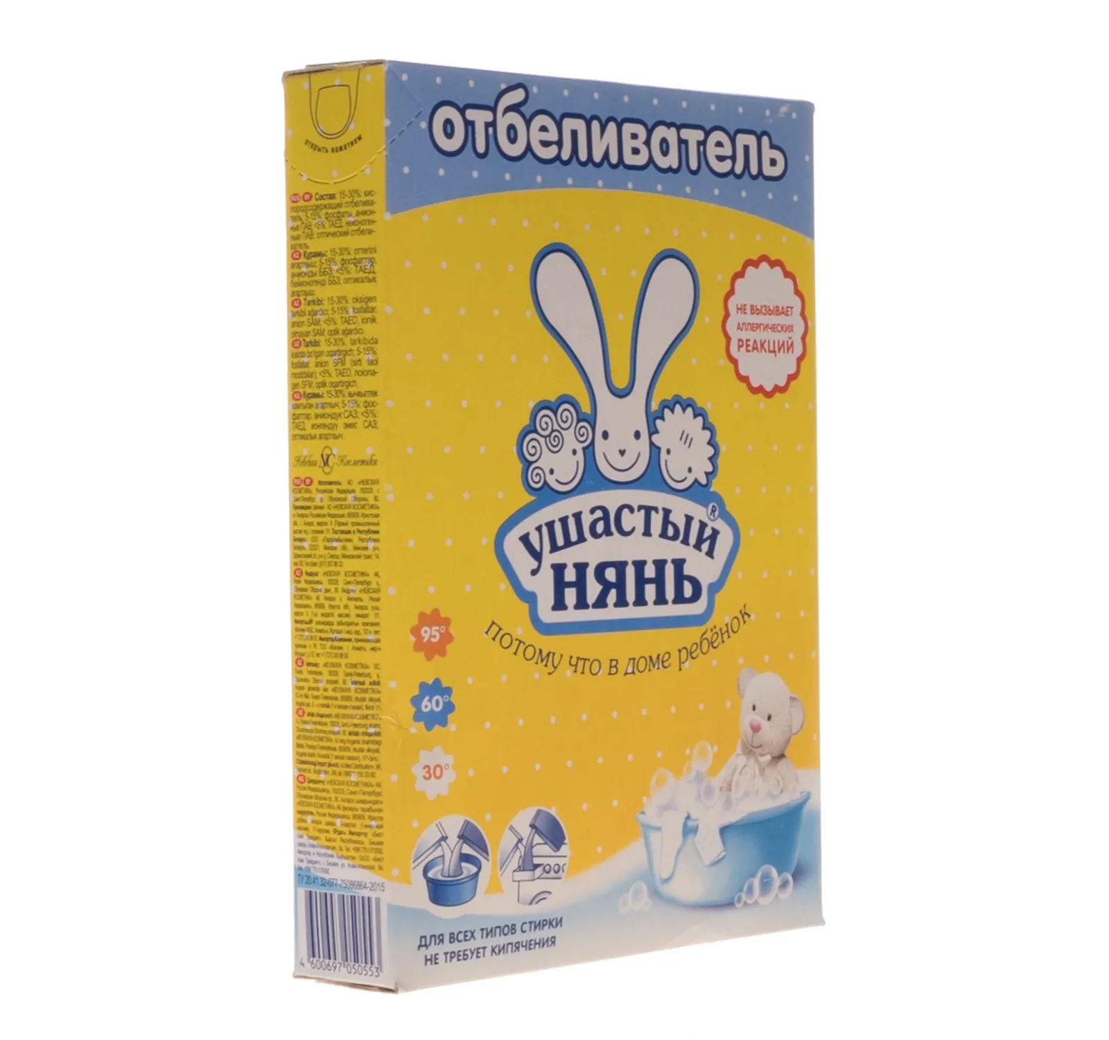 Разработан специально для усиления действия стирального порошка и отбеливания одежды детей любого возраста, в том числе новорождённых. Отбеливает без кипячения при низких температурах, а это позволяет сохранить первоначальный вид одежды даже после многократных стирок. Может использоваться для различных видов тканей как при стирке вручную, так и в стиральной машине. Позволяет экономить до 50% стирального порошка. Не содержит хлор.Состав: кислородсодержащий отбеливатель (> 30%), сульфаты (15-30%), фосфаты (5-15%), карбонаты (5-15%), силикаты (5-15%), анионные пав (5-15%), таед (< 5%), неионогенные пав (< 5%), фосфонаты (< 5%), оптический отбеливатель.Способ применения: при ручной стирке белья добавить необходимое количество средства непосредственно в воду, при стирке в стиральной машине добавить в соответствующий отсек.