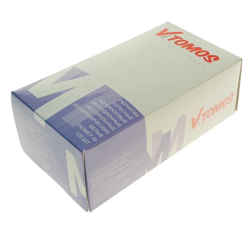 Перчатки латексные ToMoS (Томос), неопудренные, размер M. Неанатомические — без разделения на правую и левую руку. Не стерильные.
