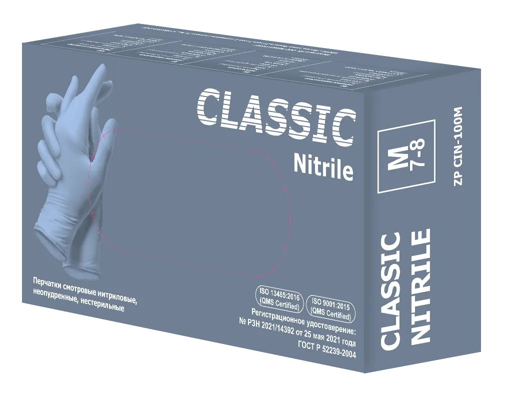 Медицинские смотровые перчатки нитриловые, неопудренные, нестерильные, голуб. ZP Classic Nitrile (M) 50 пар в упаковке.