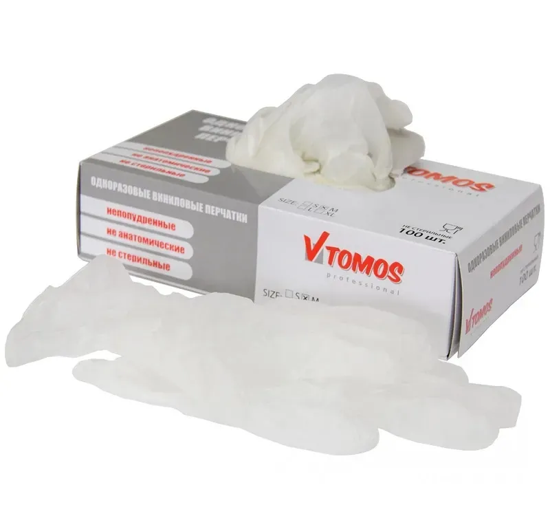 Перчатки виниловые неопудренные Томос. Защищают руки от вредного воздействия моющих и чистящих средств при уборке, стирке, пригодны для контакта с пищевыми продуктами — при разделке мяса, приготовлении пищи.