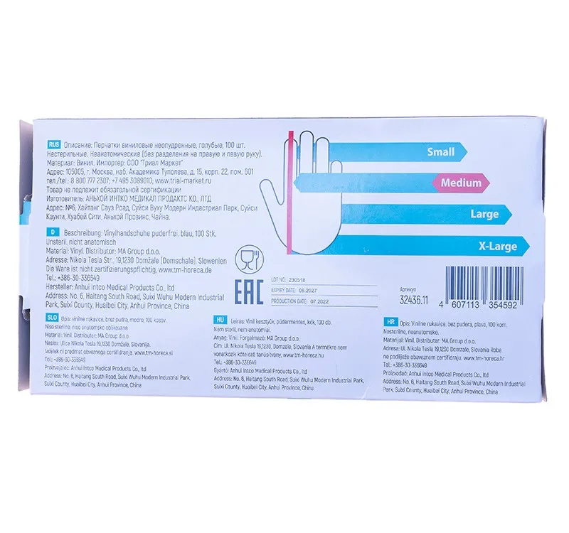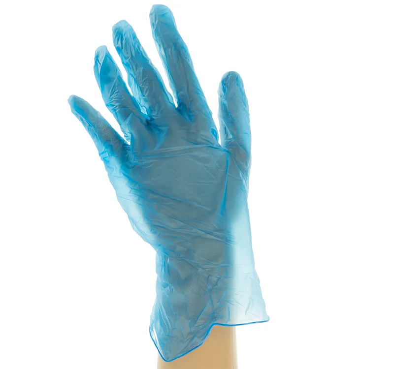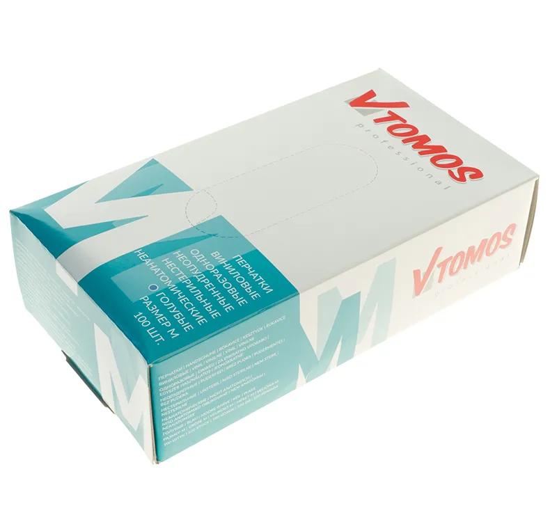 Виниловые перчатки голубые Томос, размер M, неанатомические, неопудренные. Применяются в пищевой промышленности, сфере обслуживания, стоматологиях, лабораториях и т. д.