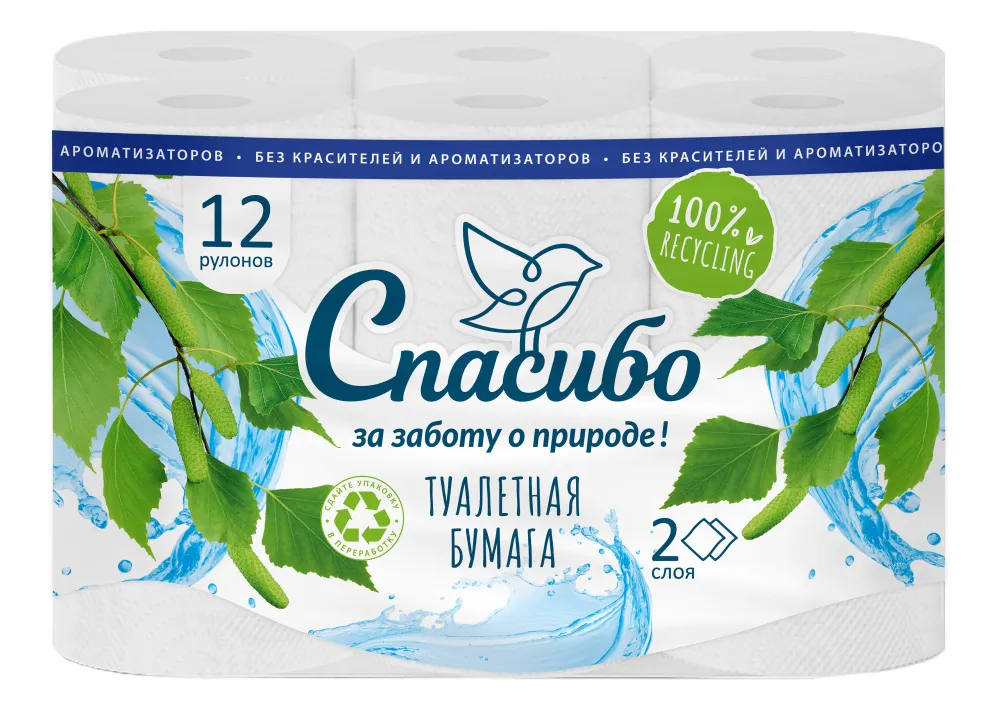 Туалетная Бумага «Спасибо за заботу о природе» 2 слоя, 12 рулонов, 13,68 метров, белая, с ручкой.