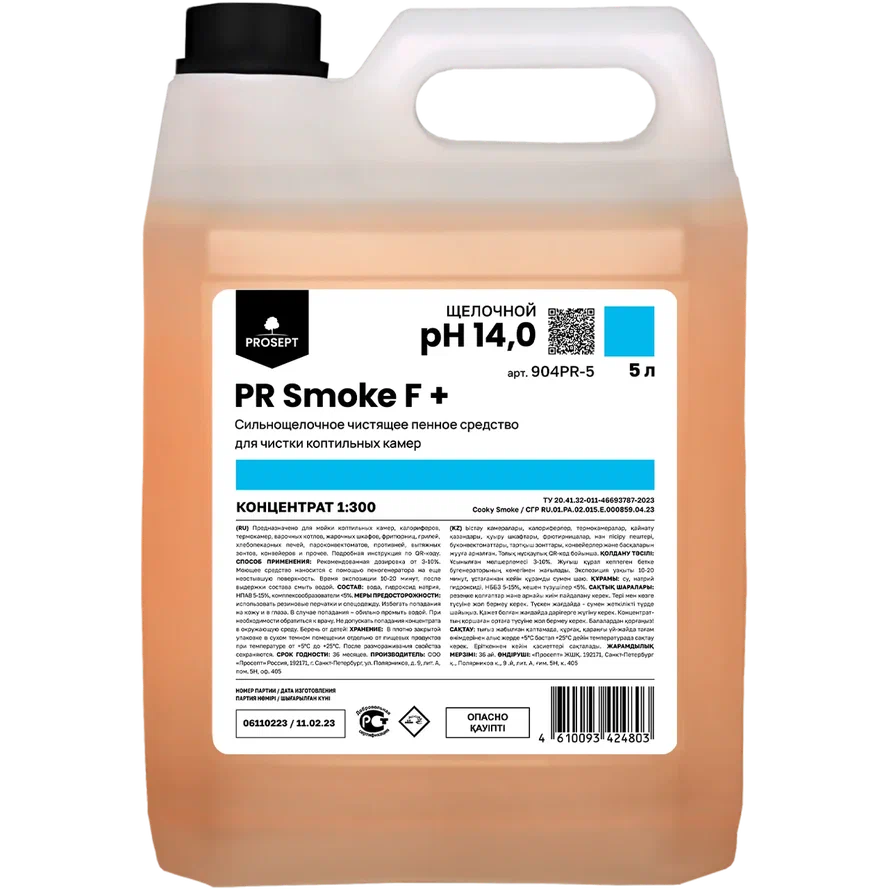 PR Smoke F+ — сильнощелочное пенное средство для эффективной очистки коптильных камер. Активно удаляет стойкие загрязнения, такие как жирные пригары, белковые остатки, дымовые смолы и копоть, обеспечивая сильное обезжиривающее действие.