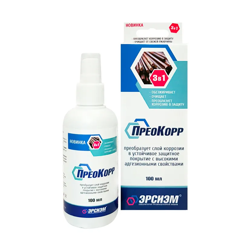 Преобразователь ржавчины «ПреоКорр» предназначен для предотвращения коррозионных потерь металлов и повышения их устойчивости к коррозии, для преобразования всех видов ржавчины металлических поверхностей (кроме цветных металлов) различных объектов в промышленности (пищевой, перерабатывающей, машиностроительной, топливно-энергетической, нефтеперерабатывающей и др.), в Вооруженных Силах РФ, на транспорте, в строительной индустрии, в ЖКХ, в сфере услуг (ремонт, реставрация и т. п.) и в быту.