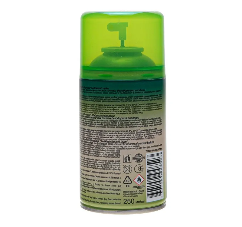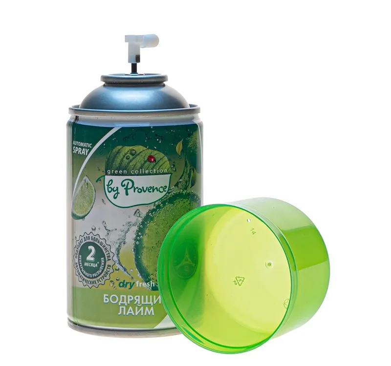 Освежитель воздуха "Green collection Green Collection by Provence" Бодрящий лайм. Сменный универсальный аэрозольный баллон для автоматических систем дезодорации воздуха. Яркий коктейль сочного лайма и свежего имбиря зарядит позитивной энергией, легко создаст и поддержит в течение длительного времени радостное настроение бодрости. Подходит для всех автоматических систем, предназначен для постоянной ароматизации воздуха в любом помещении. Действует в течение 2-х месяцев непрерывного использования. Объём - 250 мл. Сухое распыление.