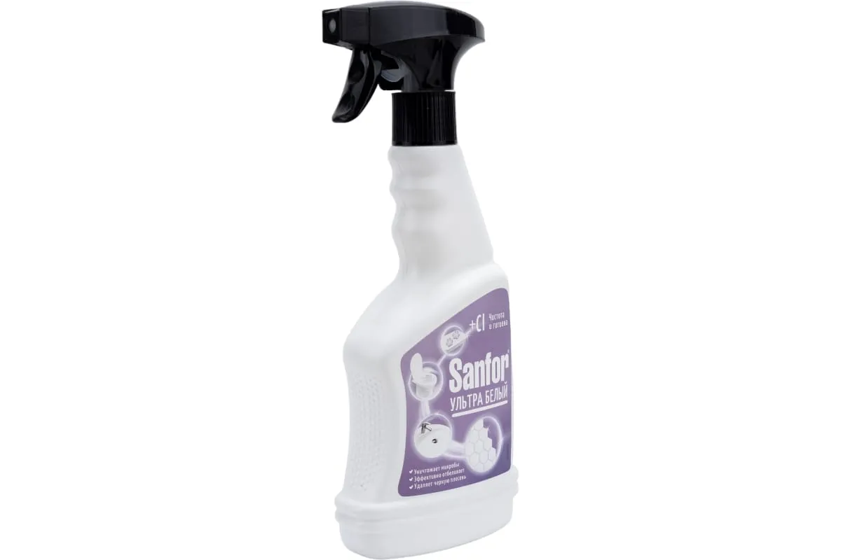 Эффективная формула спрея Sanfor «Ультра Белый» отлично отбеливает и чистит поверхности по всему дому, уничтожает микробы, удаляет плесень, жир, грязь, мыльные потеки, серый налет, пятна различного происхождения, устраняет неприятные запахи.