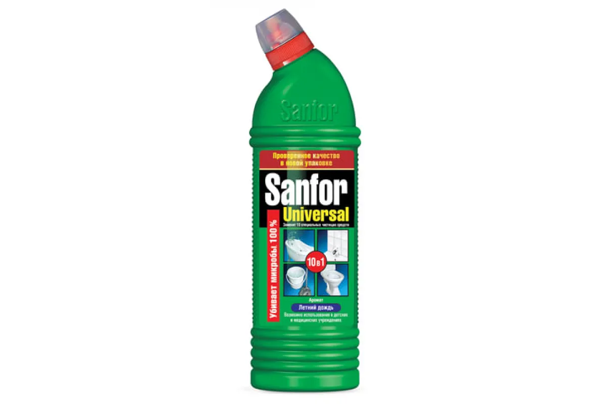 Одно средство Санфор Универсал заменит 10 специальных чистящих средств для разных поверхностей и областей применения легкой быстро отчистит раковины, ванны и душевые кабины, унитазы, сливы и водостоки, керамическую плитку, любые твердые моющиеся напольные покрытия, настенные панели, моющиеся обои, бытовую технику.