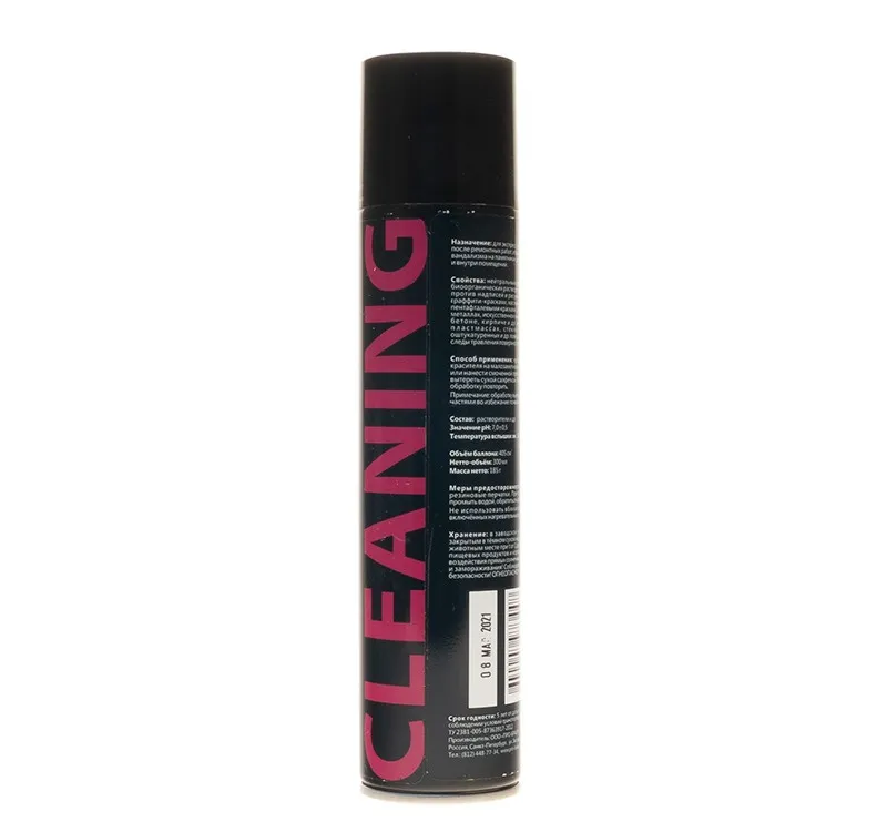 Препарат для экспресс-чистки стен и полов после ремонтных работ, а также для удаления следов вандализма на памятниках и др. уличных объектах и внутри помещений организаций общественного питания, торговых и деловых центров, спортивно-оздоровительных и культурно-досуговых сооружений, медицинских, образовательных, научных, финансовых и иных учреждений, предприятий промышленности, гостиниц и вокзалов, на всех видах транспорта, в быту.Аэрозольный нейтральный готовый к применению раствор. Эффективно против надписей и рисунков, выполненных граффити-красками, масляными, акриловыми и пентафталевыми красками, а также маркером на металлах, искусственном и натуральном камне, бетоне, кирпиче и др. керамике, гипсе, пластмассах, стёклах, деревянных, оштукатуренных и др. поверхностях. Не удаляет следы травления поверхностей. Легко воспламеняемо.рН 7, Про Брайт