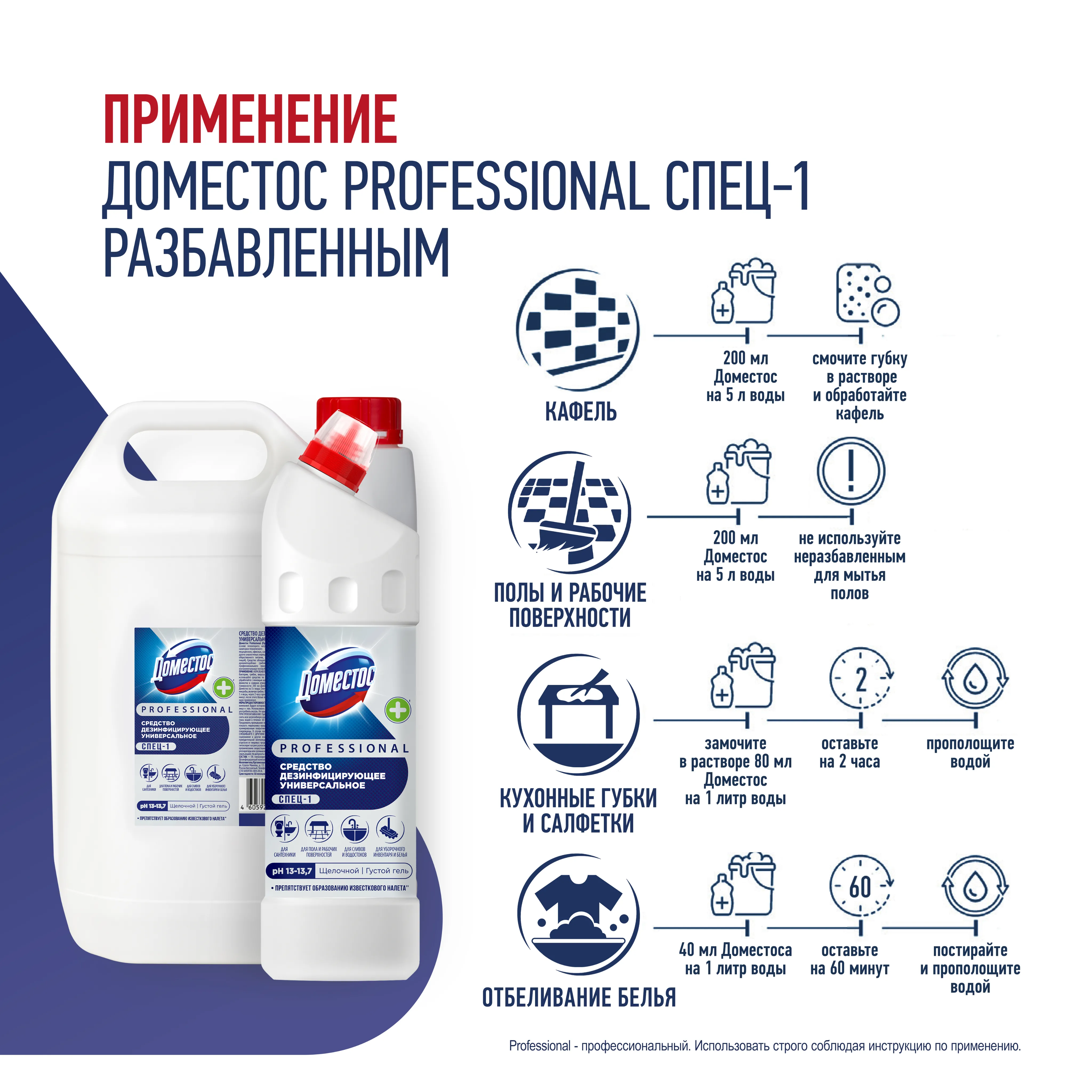 - Замачивание Отбеливание белья: 40 мл Domestos на 1 л воды, замочить белье на 60 минут, после этого белье постирать и прополоскать водой. Губки, салфетки и МОПы: замочить в растворе 80 мл Domestos на 1 л воды, через 2 часа прополоскать водой.