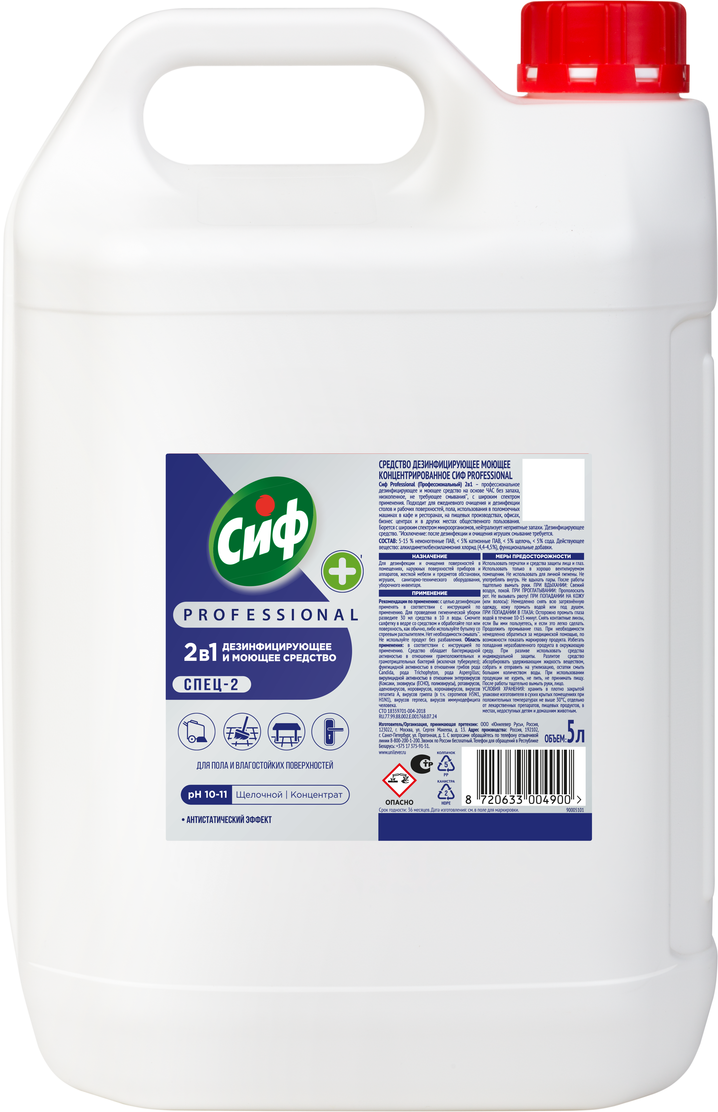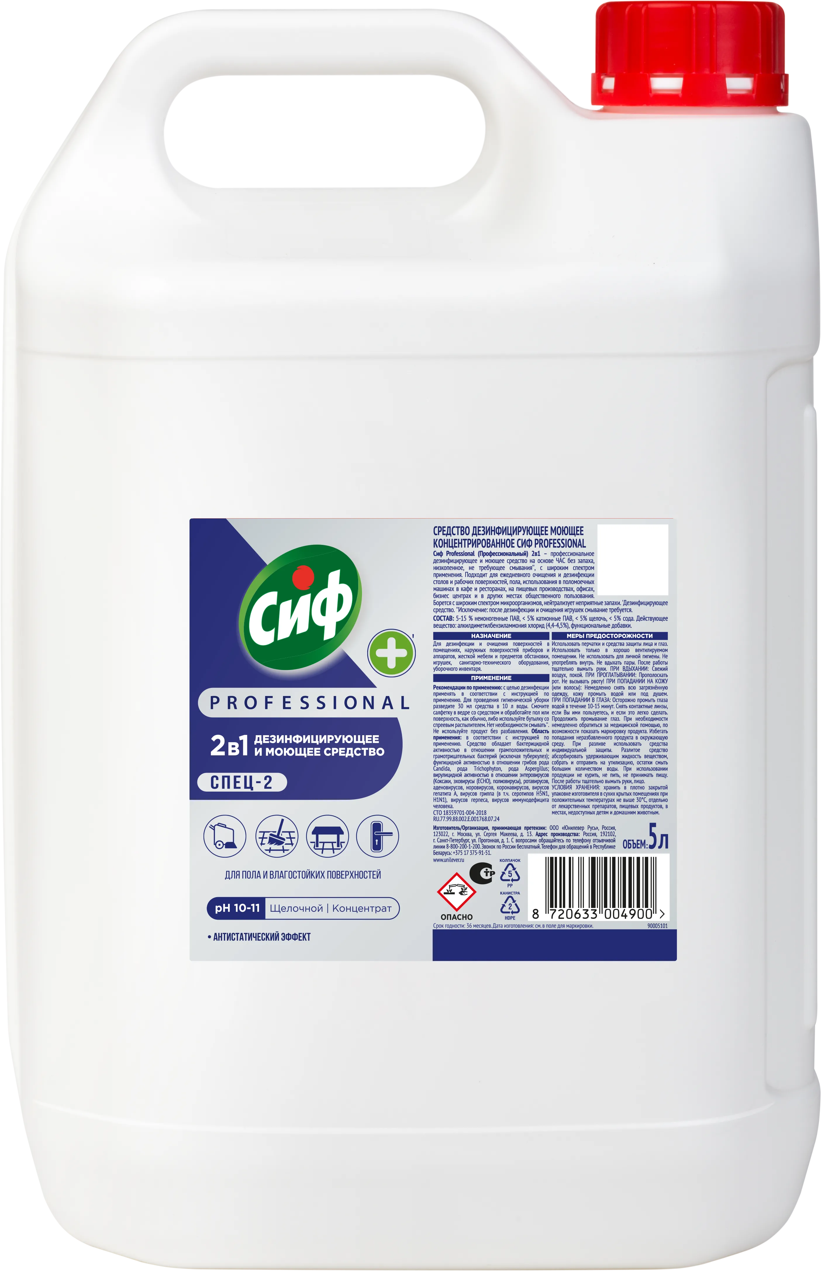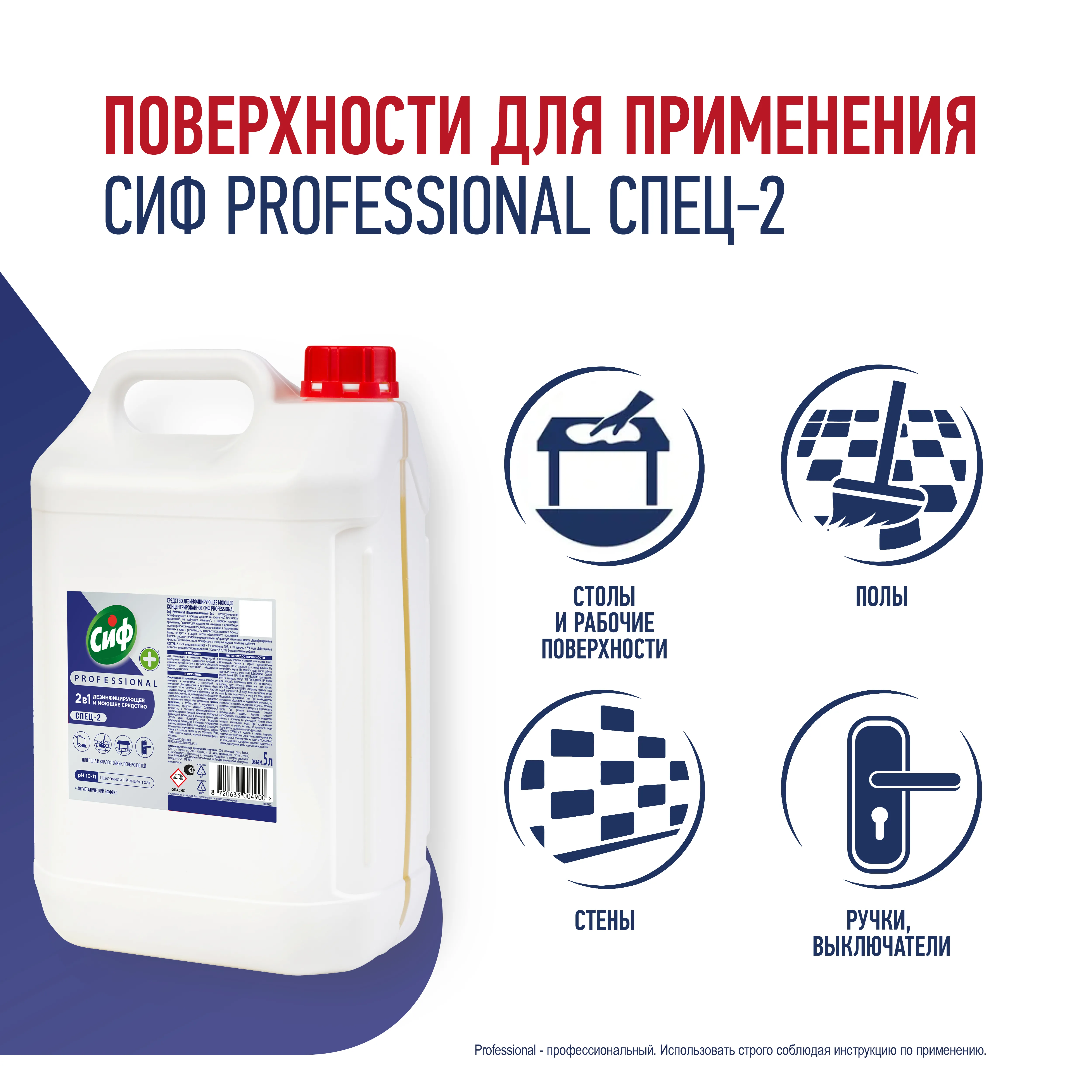 Cif Professional 2в1 — это универсальное низкопенное средство с широким спектром применения, не требующее смывания*. Благодаря особенной формуле Cif Professional эффективно борется с широким спектром микроорганизмов и нейтрализует неприятные запахи. Cif Professional 5 л концентрат отлично подходит для очищения поверхностей в различных помещениях, жесткой мебели, предметов обстановки, игрушек и санитарно-технического оборудования, а также поверхностей приборов и аппаратов. Можно обрабатывать столы и стулья, ручки и выключатели, полы и стены.