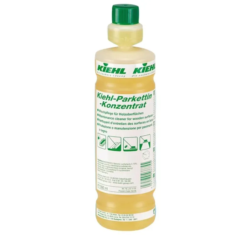 Средство эффективно очищает и распространяет приятный запах. Высыхая без разводов, образует на поверхности пола износостойкую грязеотталкивающую и нескользкую защитную плёнку. После обработки пола с Kiehl-Parkettin-Konzentrat коэффициент трения скольжения достигает 0,4 µ и 0,6 µ, что соответствует требованиям стандарта DIN 18032, часть 2 предъявляемых к полам в спортивных залах (продукт испытан институтом Отто-Граф в г. Баден-Вюртемберг). Особенно подходит для уборки и ухода полов в спортивных залах, что в значительной мере снижает образование следов обуви. Паркетная доска и ламинат получают дополнительную защиту от проникновения влаги в швы. А полирование уплотняет защитную плёнку, повышает её износостойкость и улучшает внешний вид пола.Состав (в соответствии с 648/2004/EС): Неионогенные ПАВ 5-15%, водорастворимые растворители, синтетическое мыло, защитные субстанции, вспомогательные вещества, красящие вещества, ароматические вещества (Hexyl Cinnamal, Benzyl Salicylat, Citronellol, Lilial, Lyral, Linalool). Показатель рН (в концентрате): ок. 4,5 Показатель рН (в растворе): ок. 7 Указание: Слишком мокрая уборка или стоячие лужицы на полу могут привести к повреждению пола! Только для профессионального использования!Области применения: Применяется для ухода промасленных, покрытых маслянным воском или защитным слоем деревянных поверхностей, паркета и ламината. Не применять на полах из необработанного дерева и на вощенных полах.Применение: 1 доза (содержимое дозирующего колпачка) = 25 млПервичное нанесение: Для достижения хорошего сцепления и безупречного внешнего вида пол следует предварительно очистить от жировых загрязнений, силикона и пыли. Приготовьте раствор для первичного нанесения (1 доза на 0,5 мл холодной воды) и нанесите его на пол отжатым мопом. Не допускайте, чтобы на полу оставались лужицы!Уход с интервалом: Разведите 1 дозу в 8 л холодной воды. Окуните моп (салфетку) в рабочий раствор и основательно отожмите. Не допускайте, чтобы на полу оставались лужицы!Спрей-клининг: Приготовленный раствор (1 доза на 0,5 л холодной воды) наносите с помощью флакона-распылителя и сразу же обрабатывайте быстроходной однодисковой машиной (ок. 1000 об/мин).Полирование: Образовавшуюся после высыхания плёнку можно уплотнить с помощью быстроходной однодисковой машины (ок. 1000 об/мин) и Multi-Disc, но при этом пол не становится скользким.Объём: 1 л