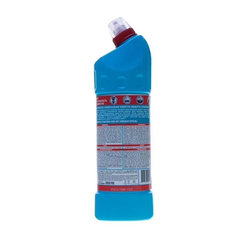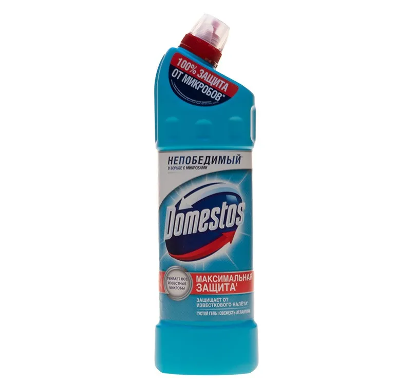 Внеразбавленном виде средство можно использовать для очищения и дезинфекции унитаза, ванны, раковины, стоков и сливов, а в разбавленном — для мытья множества поверхностей (пол, кафельные поверхности, плитка, рабочие поверхности на кухне, мусорные ведра) и даже для отбеливания белья и тканей. Ознакомьтесь с инструкцией по применению для каждого вида поверхностей. Благодаря особой формуле с дезинфицирующим эффектом и чистящими компонентами Domestos убивает все известные микробы, максимально очищает грязь и устраняет неприятные запахи. Уникальная формула геля Domestos предотвращает появление известкового налета. Густая текстура геля Domestos обеспечивает очищение и убивает бактерии, грибки, вирусы и споры. Изогнутый дозатор обеспечит удобство использования.Состав: < 5% гипохлорит натрия, анионные ПАВ, неионогенные ПАВ, мыло, отдушка.Способ применения:Колпачок защищён от открывания детьми. Чтобы открыть, надавите на уплотнения по бокам колпачка и поверните против часовой стрелки. Чтобы закрыть, поверните колпачок по часовой стрелке до щелчка.Применение неразбавленным:— унитаз: нанесите Domestos под ободок унитаза (около 80 мл). Для максимального эффекта оставьте на ночь. Domestos очистит грязь, устранит неприятные запахи и уничтожит микробы.— раковины и ванны: нанесите Domestos на поверхность и обработайте с помощью щетки. Через 5 минут тщательно смойте. Domestos очистит грязь и уничтожит микробы, включая грибок.— сливы и водостоки на кухне и в ванной: налейте Domestos в сливное отверстие, оставьте на 5 минут, затем промойте водой.Применение разбавленным:— полы и рабочие поверхности: 4 колпачка Domestos на 5 л воды. Не используйте неразбавленным для мытья полов.— кафель: 4 колпачка Domestos на 5 л воды. Смочите губку в растворе и обработайте кафель. Domestos очистит поверхность и уничтожит микробы, включая грибок.— губки для мытья посуды: промойте в специальном растворе с дезинфицирующим эффектом: 2 колпачка Domestos на 3 литра воды.Меры предосторожности: Перед использованием ознакомиться с маркировкой продукта. Использовать перчатки и средства защиты лица и глаз. Использовать только в хорошо вентилируемом помещении. Не вдыхать пары. После работы тщательно вымыть руки. Хранить в недоступном для детей месте. При вдыхании: свежий воздух, покой. При проглатывании: прополоскать рот. Не вызывать рвоту!При попадании на кожу (или волосы): немедленно снять всю загрязненную одежду, кожу промыть водой или под душем. При попадании в глаза: осторожно промыть глаза водой в течение нескольких минут. Снять контактные линзы, если Вы ими пользуетесь. Продолжить промывание глаз. При необходимости немедленно обратиться за медицинской помощью, по возможности показать маркировку продукта.Объём: 1 л