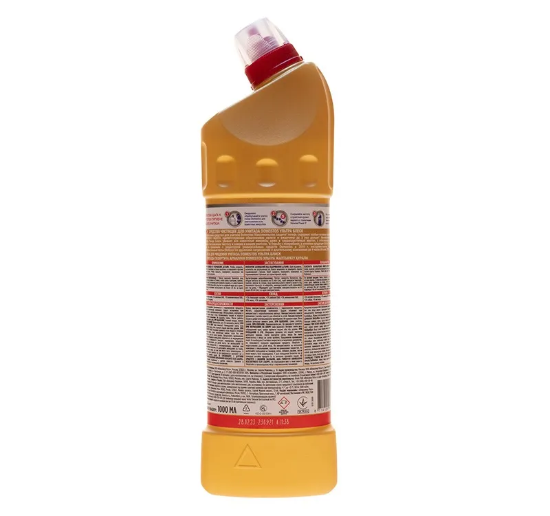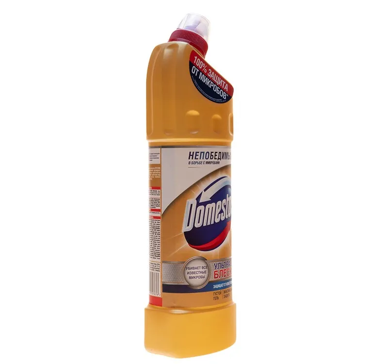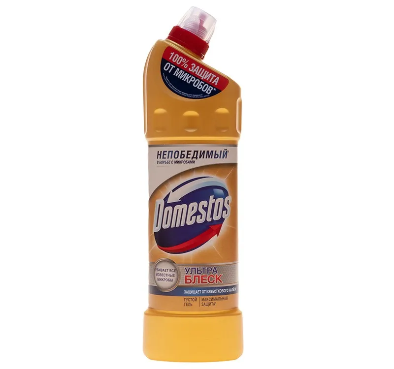 Средство для сантехники с усиленным дезинфицирующим эффектом Domestos Ультраблеск 1 л. Domestos — признанный эксперт в заботе о чистоте туалета и ванной комнаты. Чистящее средство для унитаза Ультра Блеск поможет легко и быстро привести в порядок туалет и уничтожить микробы. Инновационный изогнутый дозатор обеспечивает максимальную зону поражения микробов благодаря носику, который до 3 раз эффективнее в труднодоступных местах и под ободком унитаза. Благодаря особой густой формуле с дезинфицирующим эффектом и чистящими компонентами Domestos Ультра Блеск не только очищает, но и обеспечивает сияющий блеск поверхностей.Назначение:Средство предназначено для очистки унитаза от различных загрязнений. Благодаря инновационному 7-струйному дозатору эффективно очищает унитаз и убивает микробы, добираясь даже до самых труднодоступных мест, и обеспечивает сияющую чистоту.Способ применения: Нанести средство под ободок унитаза (около 80 мл). Для наилучшего результата оставить на 15 минут.Меры предосторожности: При работе использовать резиновые перчатки. При попадании средства в глаза или на кожу промыть большим количеством воды, при необходимости обратиться к врачу. Хранить в недоступном для детей месте, вдали от пищевых продуктов.Условия хранения: Хранить в сухом прохладном месте в вертикальном положении. Предохранять от попадания прямых солнечных лучей.Срок годности: 18 месяцев с даты изготовления.