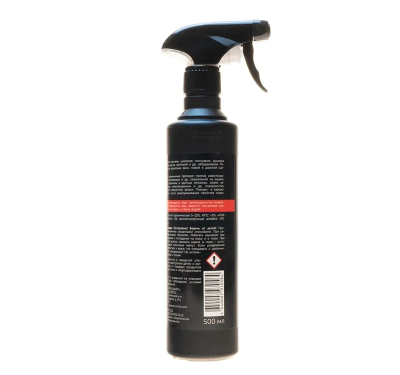 Триггер, готовый растворПрепарат для чистки раковин, унитазов, писсуаров, ванн в гигиенических и иных зонах торговых и деловых центров, медицинских, образовательных, научных, финансовых и иных учреждений, спортивно-оздоровительных и культурно-досуговых сооружений, организаций общественного питания, предприятий промышленности, гостиниц и вокзалов, на всех видах транспорта и в быту. Рекомендуется для чистки акриловых ванн, новой и дорогой сантехники.Жидкий кислотный готовый к применению раствор от Про Брайт. Эффективно против известкового налёта, мыльных, масложировых и др. загрязнений на акриле, нержавеющей стали, эмали, керамике и др. поверхностях. Придаёт блеск. Образует защитную плёнку, замедляющую последующее загрязнение. Удаляет неприятные запахи. Обладает бактерицидными свойствами
