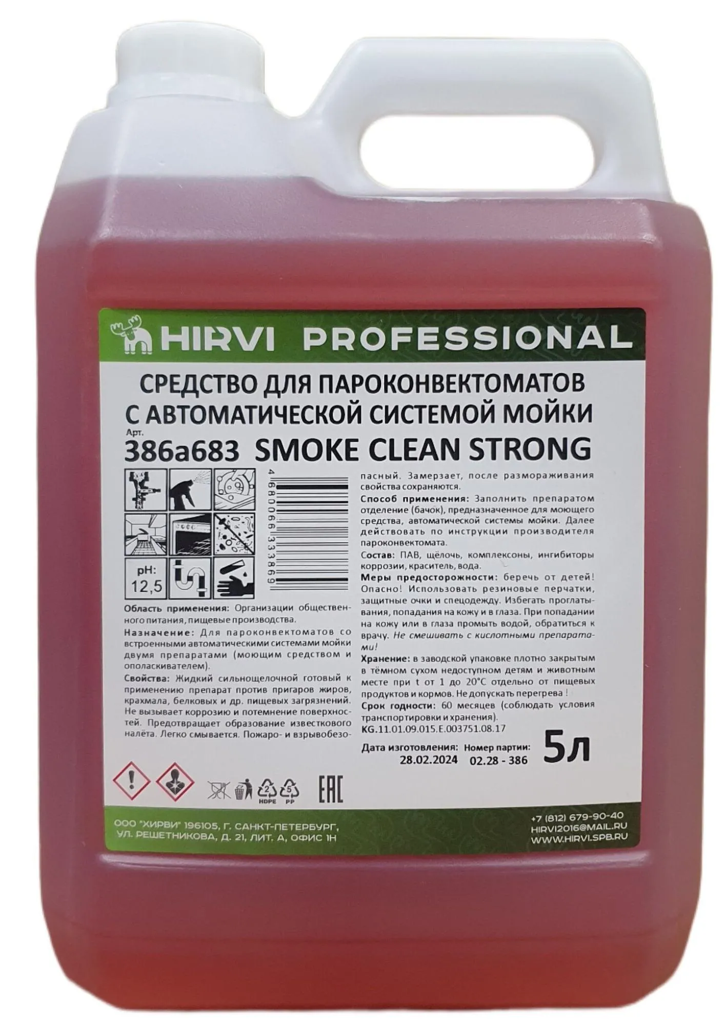 SMOKE CLEAN Strong — Жидкий сильнощелочной готовый к применению препарат для пароконвектоматов со встроенными автоматическими системами мойки двумя препаратами (моющим средством и ополаскивателем), против пригаров жиров, крахмала, белковых и др. пищевых загрязнений. Не вызывает коррозию и потемнение поверхностей.