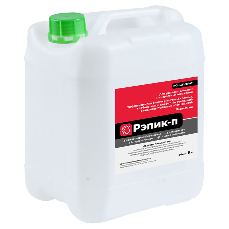 Концентрированное кислотное средство на основе кислот для снятия солей жесткости, ржавчины, удаления окисных, цементных и известковых отложений, глубокой очистки и удаления высолов от атмосферных загрязнений.