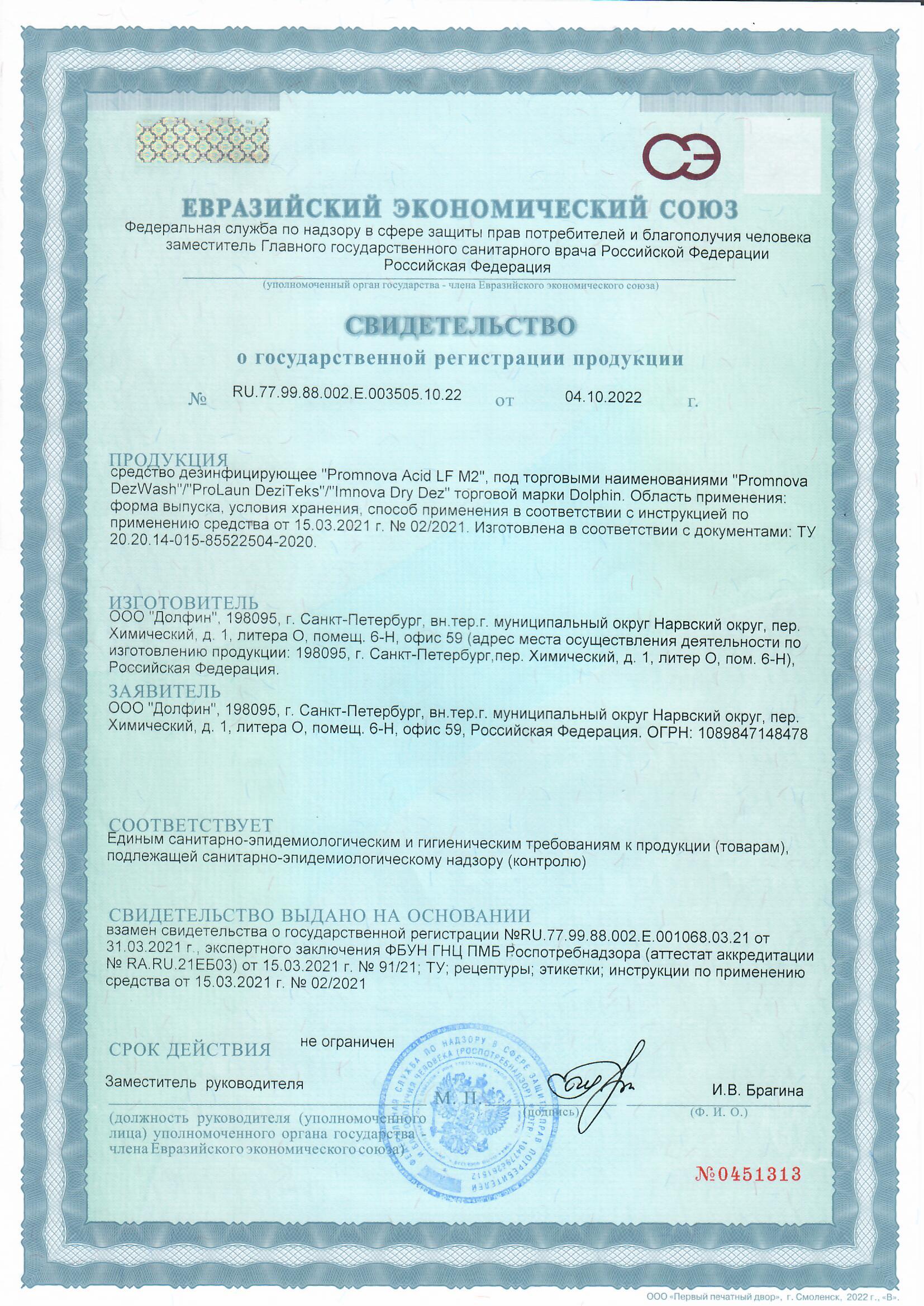 - Механизированный метод Средство используется в виде водного раствора, приготовленного посредством автоматического дозатора, устойчивого к надуксусной кислоте. Дозировка и время экспозиции указана в инструкции №02/2021 по применению дезинфицирующего средства Promnova Acid LF M2.