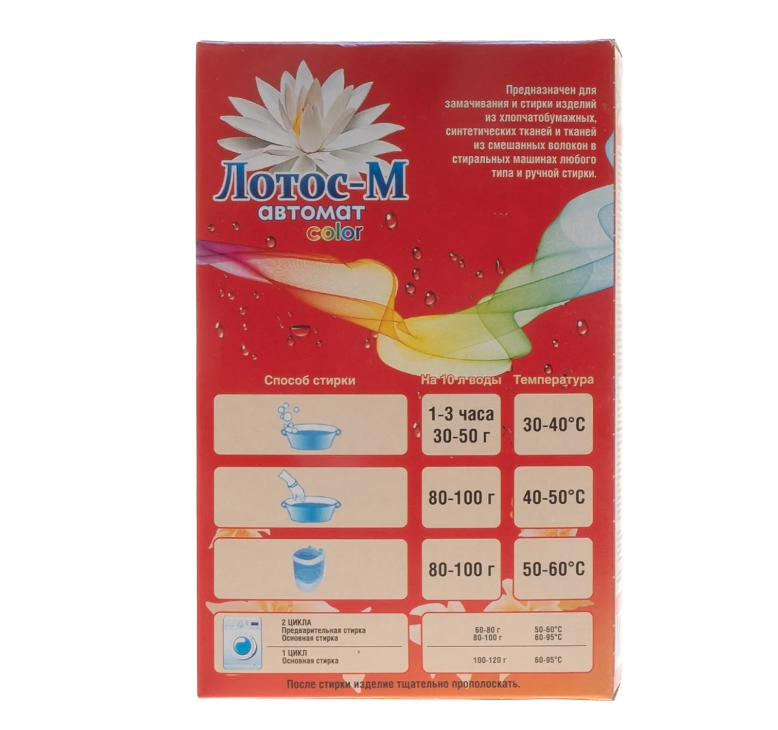 Предназначено для стирки изделий из хлопчатобумажных, льняных, синтетических тканей и тканей из смешанных волокон в автоматических стиральных машинах, машинах активаторного типа и вручную.