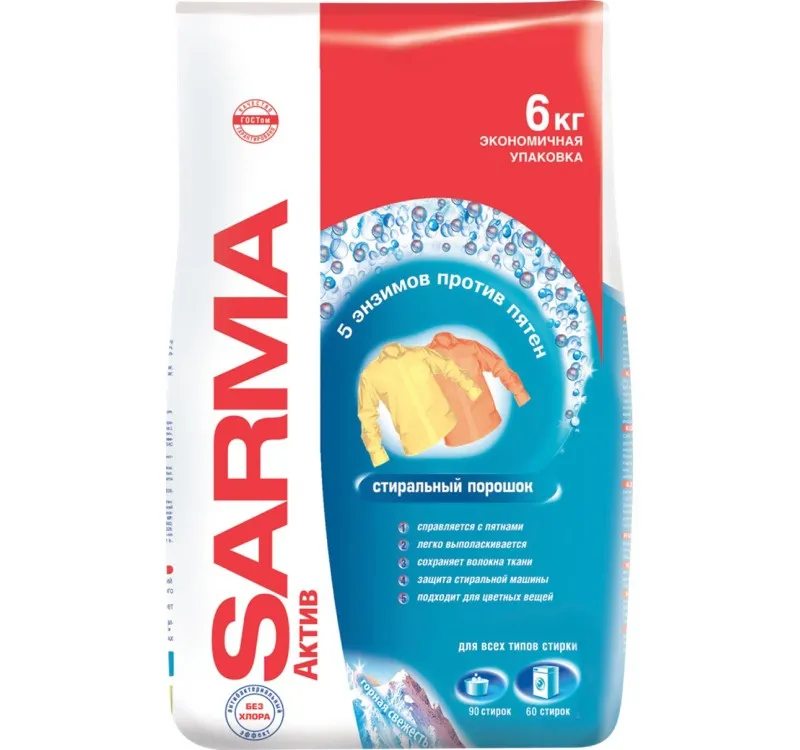 Универсальный стиральный порошок Sarma Актив Горная свежесть для цветного и белого белья 4,5 кг предназначен для стирки изделий из хлопчатобумажных, льняных, синтетических тканей, а также тканей из смешанных волокон. Может использоваться для ручной стирки и стирки в машинах активаторного типа. Особенно эффективен для стирки и отбеливания хлопчатобумажных и льняных тканей. Лёгкий аромат горной свежести подарит прекрасное настроение при каждой стирке белья.Состав:фосфаты (15-30 %); кислородсодержащие отбеливающие вещества (5-15 %), анионные ПАВ (5-15 %); пеногаситель (< 5 %), неионогенные ПАВ (< 5 %),поликарбоксилаты (< 5 %); энзимы, оптические отбеливатели, отдушка.Способ применения: Ручная стирка (на 10 л воды) 30–60’С: — Среднее загрязнение: в мягкой/средней по жёсткости воде — 100 мл (60 г), в жёсткой/очень жёсткой воде — 25 мл; Замачивание (на 10 л воды) на 2 часа при t 40–60’С: Автоматическая стиральная машина (на 4–5 кг белья) 30-95С: — Среднее загрязнение: в мягкой/средней по жёсткости воде — 180 мл (100 г), в жёсткой/очень жёсткой воде — 225 мл.Меры предосторожности: Осторожно. Может причинить вред при проглатывании. При попадании на кожу и в глаза может вызывать раздражение. Беречь от детей. После работы вымыть руки. При попадании на кожу и в глаза промыть большим количеством воды. Использовать резиновые перчатки. При плохом самочувствии обратиться к врачу. Избегать попадания в окружающую среду. После полного использования средства упаковку утилизировать как бытовой мусор.Условия хранения: Хранить плотно закрытым, отдельно от пищевых продуктов, в недоступном для детей месте, при температуре до +35'С.Срок годности: 36 месяцев с даты изготовленияВес: 6 кг